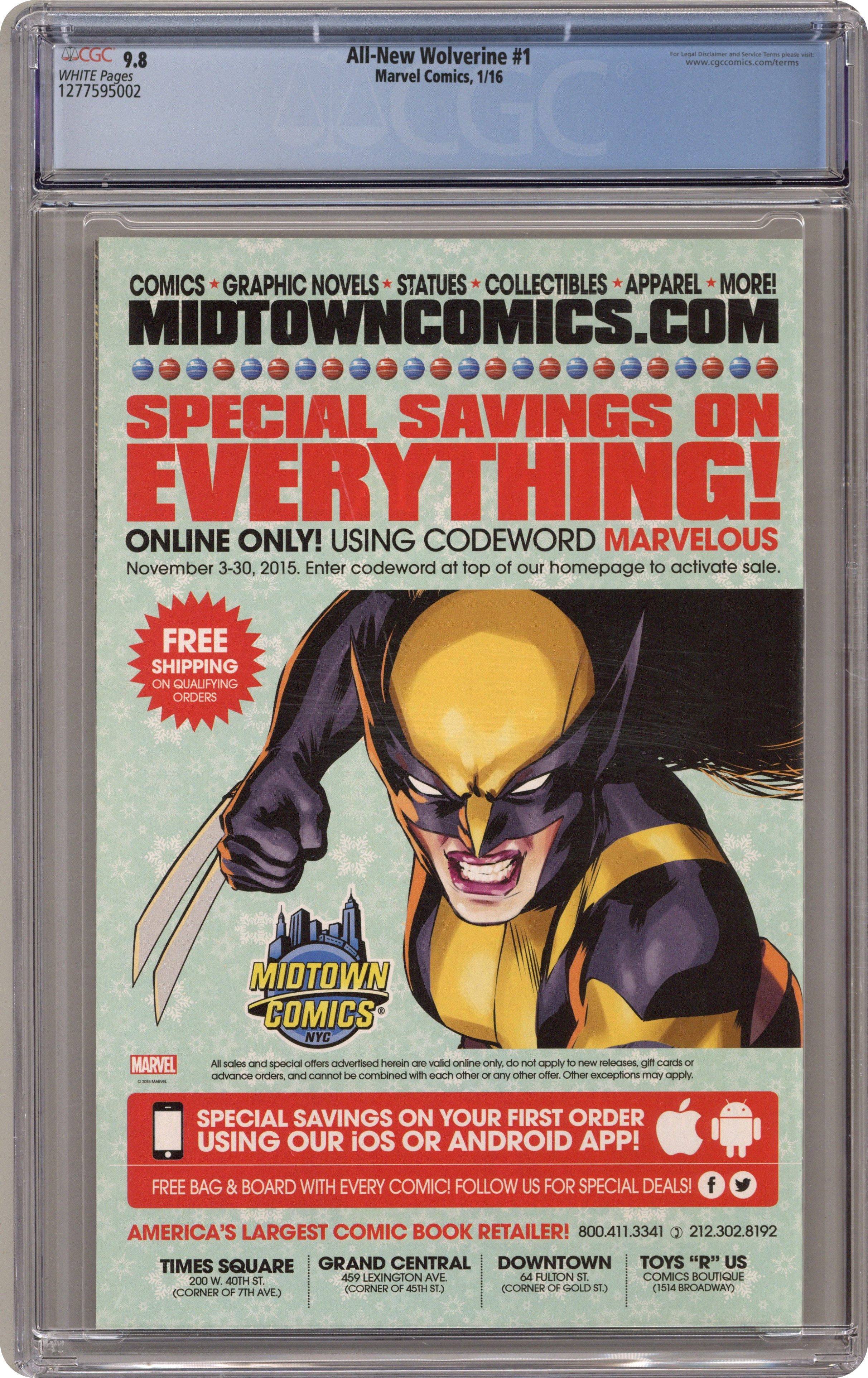 Ended Aug 16 2022 Winning Bid $101 Written by Tom Taylor. Art by David Lopez and David Navarrot. Cover by Bengal. LAURA KINNEY EMBRACES HER DESTINY. HERE! COMES! WOLVERINE! X-23 was created to be a weapon and for a time, that's all she was. But with the help of her mentor, LOGAN-the original WOLVERINE-she escaped that dark past. Tragically, Logan has fallen, but Laura will continue in his footsteps as a hero. Recent events have her doing everything in her power to keep those around her alive, as violent forces are hell-bent on mutual destruction. If anyone can stop them, it's Laura. She is the best there is at what she does. She is THE ALL-NEW WOLVERINE. 44 pages, full color. Parental Advisory Cover price $4.99. Grade: CGC 9.8 explanation of grade Condition: Used (collectible)
