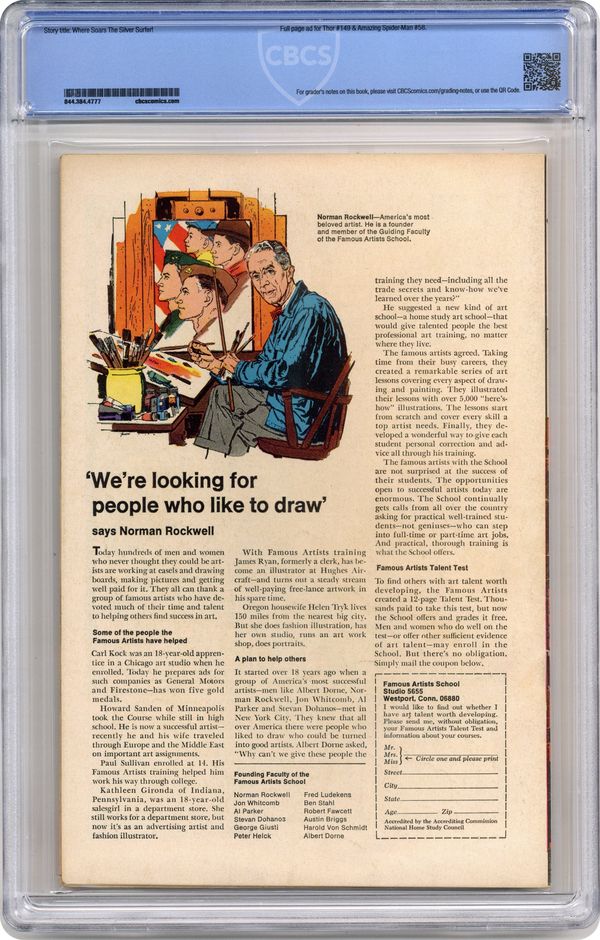 Ended Oct 12 2022 Winning Bid $206 Cover pencils by Jack Kirby, inks by Joe Sinnott. Where Soars the Silver Surfer!, script by Stan Lee and Jack Kirby (co-plot), pencils by Jack Kirby, inks by Joe Sinnott; The Fantastic Four battles the Silver Surfer. Watcher and Crystal (of the Inhumans) guest appearances. House ad for Thor #149 and Amazing Spider-Man #58. 36 pgs. $0.12. Cover price $0.12. Grade: CBCS 5.5 explanation of grade Condition: Used (collectible)