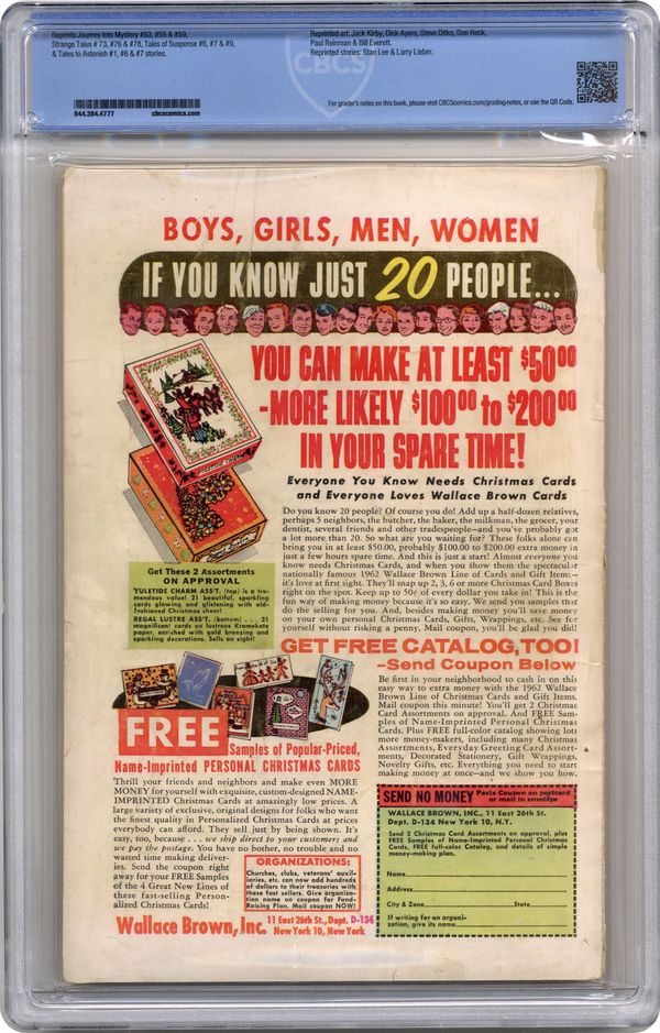Ended Sep 2 2022 Winning Bid $83 All non-superhero reprints: "I Unleashed Shagg Upon the World!" Script by Stan Lee, pencils by Jack Kirby, inks by Dick Ayers (from Journey Into Mystery 59); "I Come From the Shadow World!" Script by Lee, art by Steve Ditko (from Tales of Suspense 7); "He Waits For Us in the Glacier!" Art by Don Heck (from Tales to Astonish 7); "I Became a Human Bomb!" Art by Paul Reinman (from TTA 6); "Grottu, King of the Insects!" Script by Lee, pencils by Kirby, inks by Ayers (from Strange Tales 73); "I Know the Secret of the Poltergeist!" Script by Lee, art by Ditko (from TTA 1); "I Saw the Serpent That Saved the World!" Art by Heck (from JIM 55); "The Stranger in Space!" Art by John Forte (from JIM 53); "I Saw Diablo, the Demon From the Fifth Dimension!" Script by Lee, pencils by Kirby, inks by Ayers (from TOS 9); "I Found the Giant in the Sky!" Script by Lee, art by Ditko (from JIM 55); "Beware! The Ghosts Surround Me!" Art by Heck (from ST 76); "I Saw the Invasion of the Stone Men!" Script by Lee, art by Ditko (TTA 6); and "A Martian Walks Among Us!" Script by Lee, pencils by Kirby, inks by Ayers (from ST 78). Cover art by Kirby/Ayers taken from interior stories. Cover price $0.25. Grade: CBCS 2.5 explanation of grade Condition: Used (collectible)