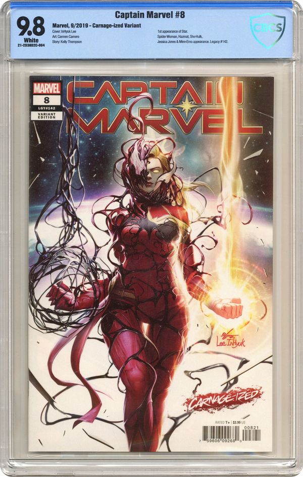 Ended Aug 2 2022 Winning Bid $49 Written by Kelly Thompson. Art by Carmen Nunez Carnero. Cover by In-Hyuk Lee. CAPTAIN MARVEL: FALLING STAR! From the moment she returned to full-time Avengers duty in New York City, Captain Marvel's life has been nonstop…and slightly weird. But she's about to take on a brand-new threat - and a very old one! When her Kree heritage is exposed to the world in dramatic fashion, Carol goes from most beloved hero to public enemy number one overnight - and it's pushing her to the darkest edge. Can she save the day even while the world turns on her? Does she want to? 28 pages, full color. Rated T+ Cover price $3.99. Grade: CBCS 9.8 explanation of grade Condition: Used (collectible)