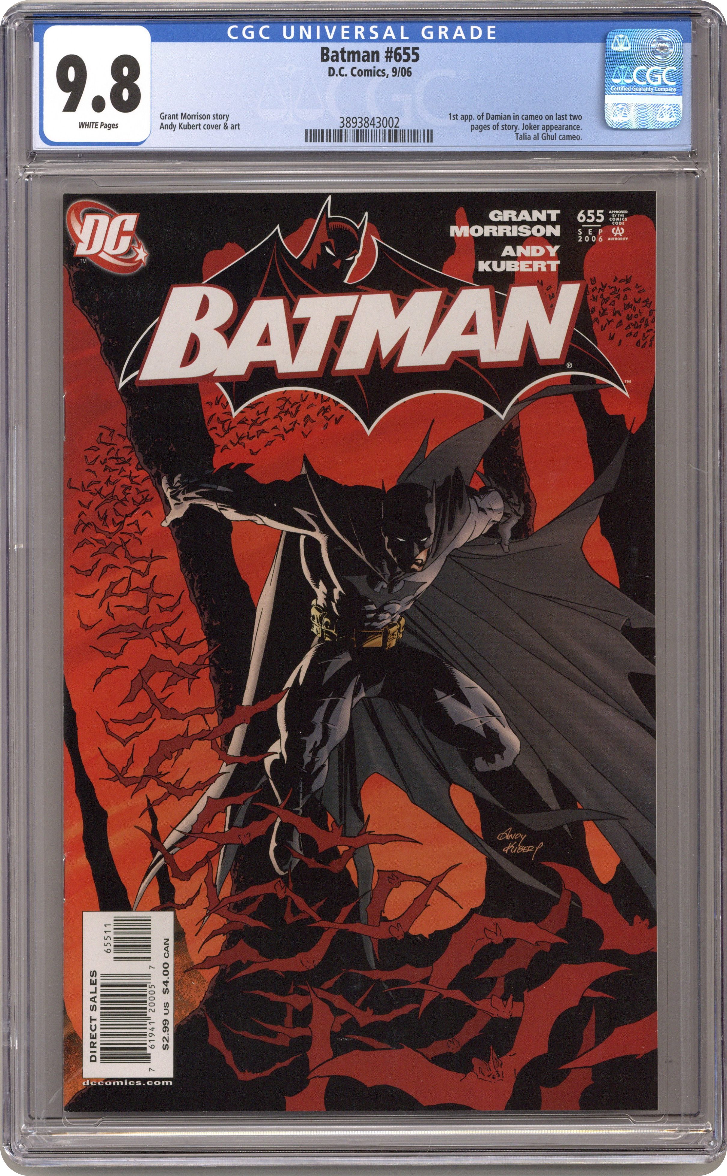 Ended Feb 5 2024 Winning Bid $127 Direct Edition. Written by Grant Morrison. Art and cover by Andy Kubert. Variant cover by Adam Kubert. Comic legends Grant Morrison (ALL STAR SUPERMAN, SEVEN SOLDIERS) and Andy Kubert (Ultimate X-Men, 1602) come together for Part 1 of "Batman and Son." After a harrowing battle with the Joker high atop Police Headquarters, Batman decides to let Bruce Wayne step into the light. But just who is watching billionaire Bruce Wayne? And what does their plan have to do with Man-Bat? 36 Pages, Full Color. Cover price $2.99. Grade: CGC 9.8 explanation of grade Condition: Used (collectible)