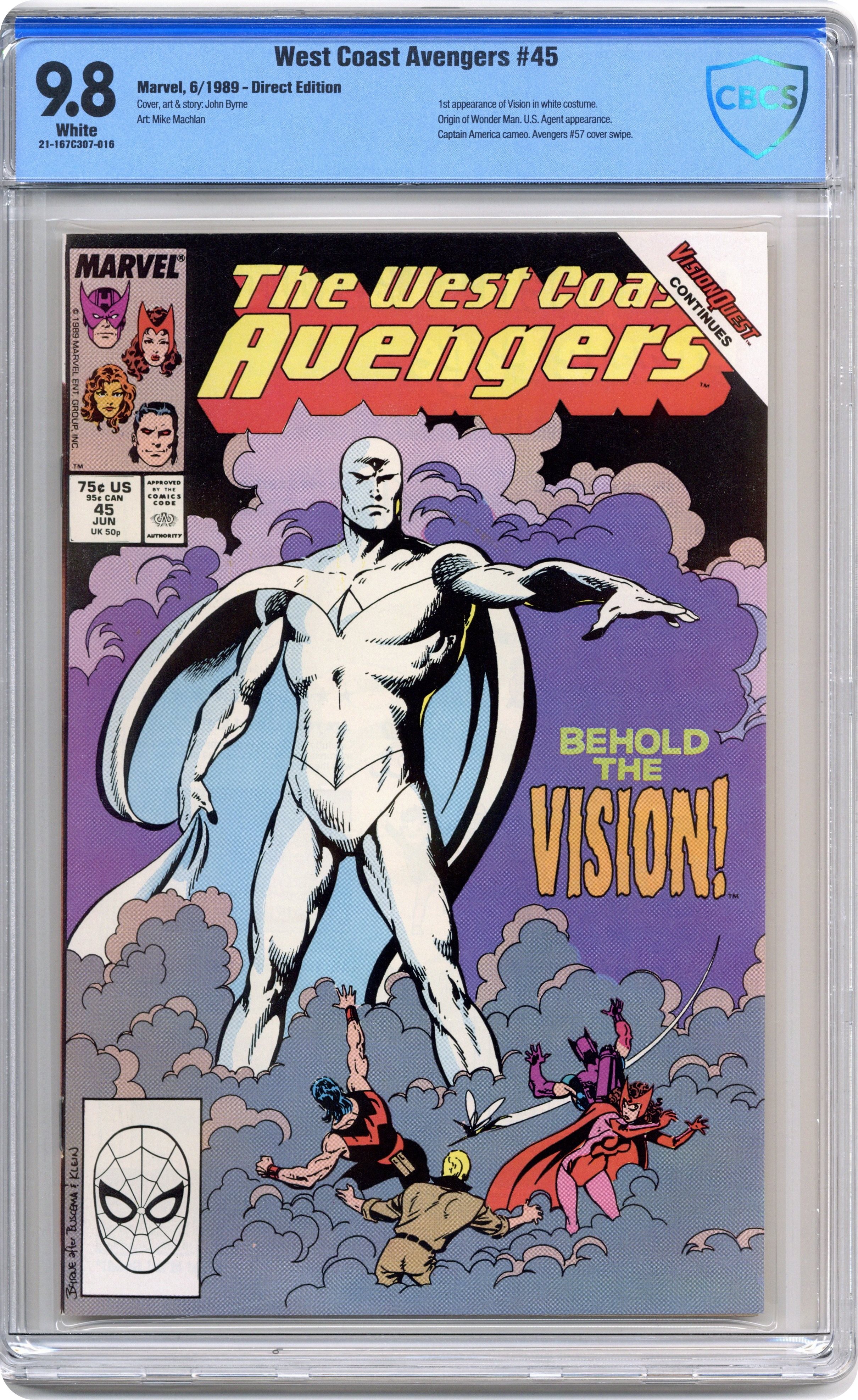 Ended Jul 16 2023 Winning Bid $230 Vision Quest Part 4 of 4. "New Faces" Script by John Byrne. Pencils by John Byrne. Inks by Mike Machlan. Cover by John Byrne. The Vision has been reassembled thanks to the brilliance and hard work of Hank Pym. But complications remain. First, the Vision's appearance has changed due to the trauma his bio-synthetic skin suffered during his disassembly. And second, while Hank has restored the Vision's memories, he can't recreate the emotional attachment to them. For that the brain patterns of Simon Williams are needed. But when Wanda finds Simon and asks him to cooperate, he refuses. Then Wonder Man faces the wrath of the Scarlet Witch! Wow, the West Coast Avengers are approaching rock bottom. And the recent addition of the U.S. Agent is not helping. (Notes: The cover to this issue is an homage to John Buscema and George Klein's classic cover to Avengers (1st series) #57 -- the first appearance of the silver age Vision. The white Vision debuted in the MCU in the final episode of the WandaVision Disney+ series. The Vision Quest storyline was a distressing read for long-time fans of the Avengers. Several years later during the Gatherers saga, the Vision regains his red-hued body. [See Avengers 360.] The letters page contains a statement of ownership: average print run 306,775; average paid circulation 178,125.) 32 pages. Cover price $0.75. Grade: CBCS 9.8 explanation of grade Condition: Used (collectible)