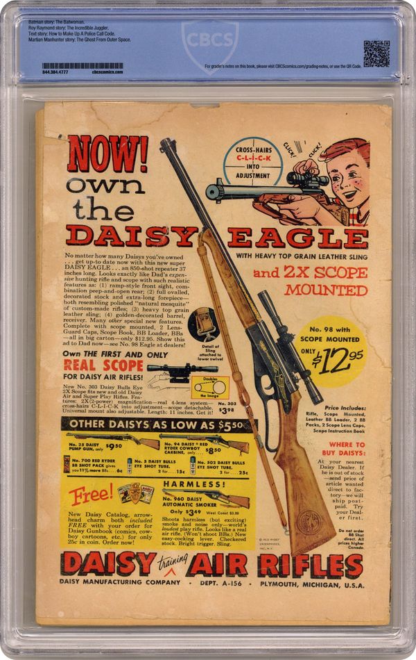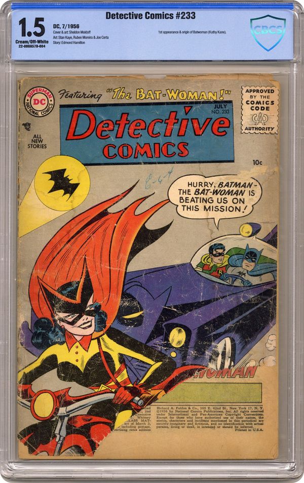 Ended Jan 20 2024 Winning Bid $771 1st appearance of Batwoman. Cover art by Sheldon Moldoff. The Batwoman starring Batman, Robin, and Batwoman (intro and origin), script by Edmond Hamilton, art by Sheldon Moldoff (as Bob Kane). The Incredible Juggler starring Roy Raymond TV Detective, art by Ruben Moreira. Casey the Cop humor page by Henry Boltinoff. How to Make Up a Police Call Code article by Jack Miller (as John Mallory). The Ghost From Outer Space starring John Jones Manhunter from Mars, art by Joe Certa. 36 pages, full color. Cover price $0.10. Grade: CBCS 1.5 explanation of grade Condition: Used (collectible)