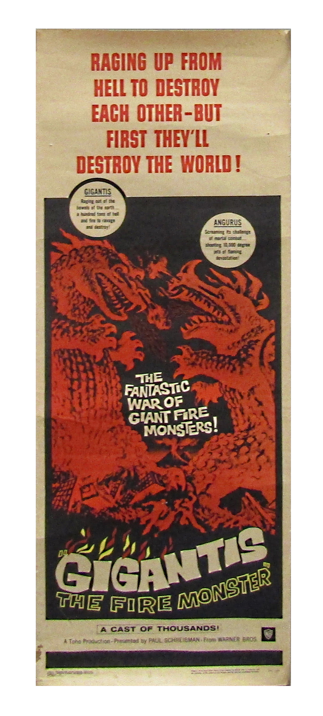 Gigantis the Fire Monster Poster (1959). High quality print on stiff stock. 14" x 36", full color. Note: Poster is rolled and displays heavy wear including multiple puncture holes. Gigantis the Fire Monster is a heavily re-edited version of Godzilla Raids Again (1955), the second Godzilla film, for the US market.