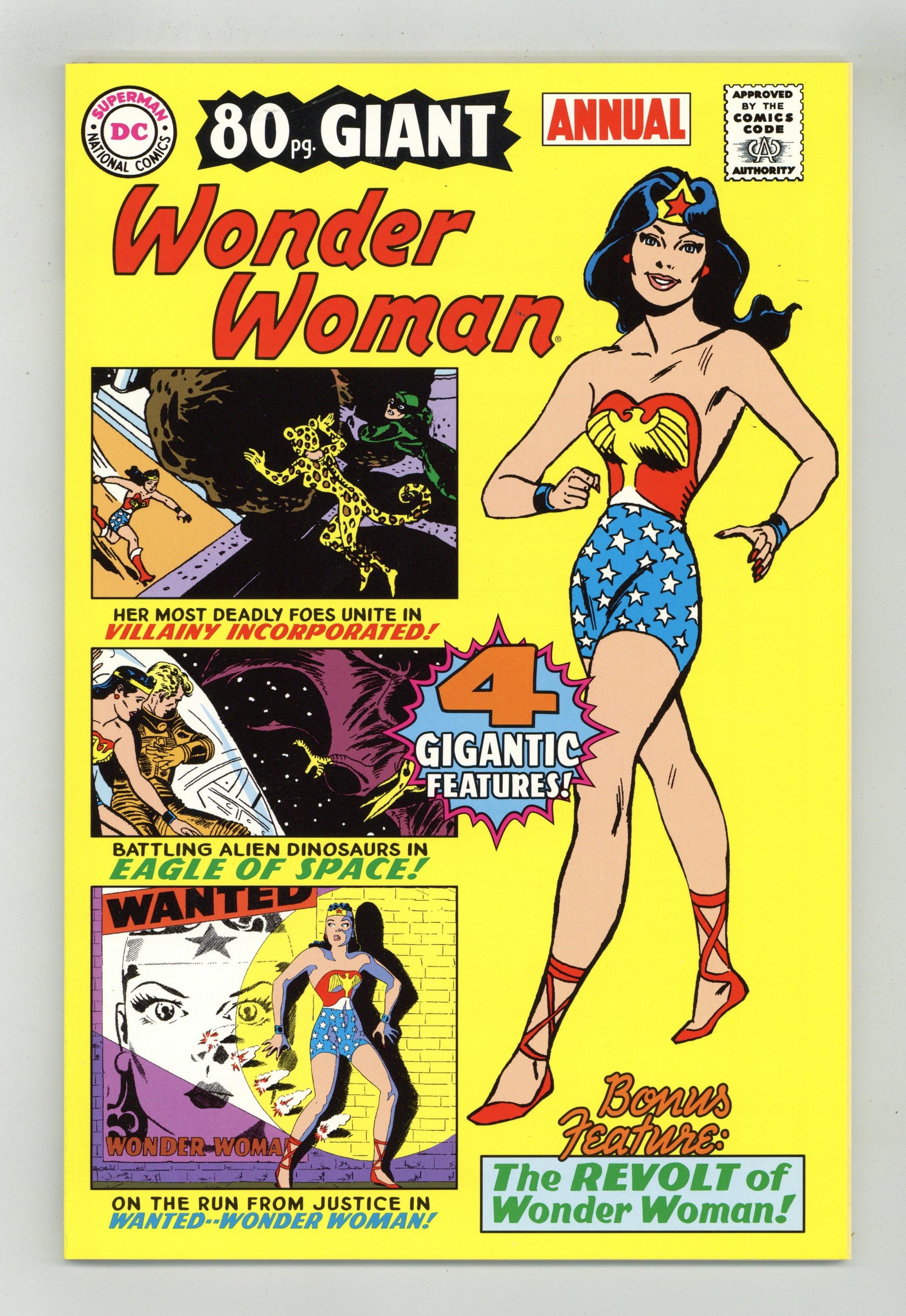 WRITTEN BY WILLIAM MOULTON MARSTON AND ROBERT KANIGHER; ART BY H.G. PETER, ROSS ANDRU, AND MIKE ESPOSITO; COVER BY PETER In stores December 18. Rescued from the vault of lost annuals, this 80-page one-shot collects four of the Amazon Princess's classic adventures! First up is a tale that is considered one of her best Golden Age escapades: "Villainy Incorporated," reprinting WONDER WOMAN (first series) #28. Also included are "Eagle of Space" from issue #105, "Wanted: Wonder Woman" from issue #108 and "Revolt of Wonder Woman!" from issue #144! For more information, see the feature article. FC, 80 PG.$4.95 Cover price $4.95. Grade: VF/NM 9.0 explanation of grade Condition: Used (collectible)