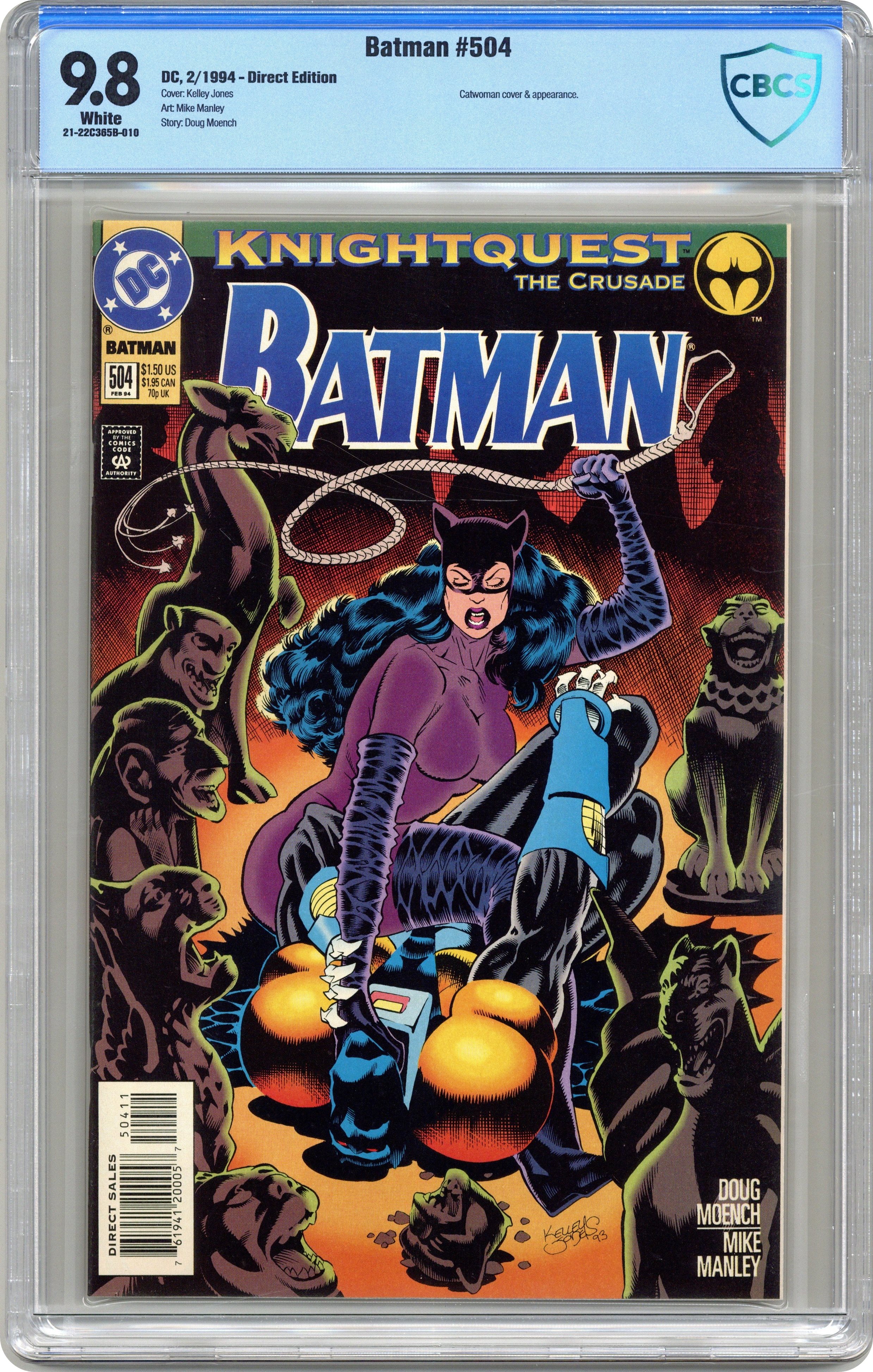 'KnightQuest: The Crusade' continues. Batman is hot on the trail of Catwoman in the belief that she's the thief behind a stolen shipment of nerve gas, while Catwoman is herself in pursuit of the real terrorist. And while she and the Dark Knight fight it out, all Gotham City is in danger. Continued in Catwoman (1993-2001 2nd Series) #7. Written by Doug Moench, with art by Mike Manley. Cover by Kelley Jones. 36 Pages, Full Color. Cover price $1.50. Grade: CBCS 9.8 explanation of grade Condition: Used (collectible)