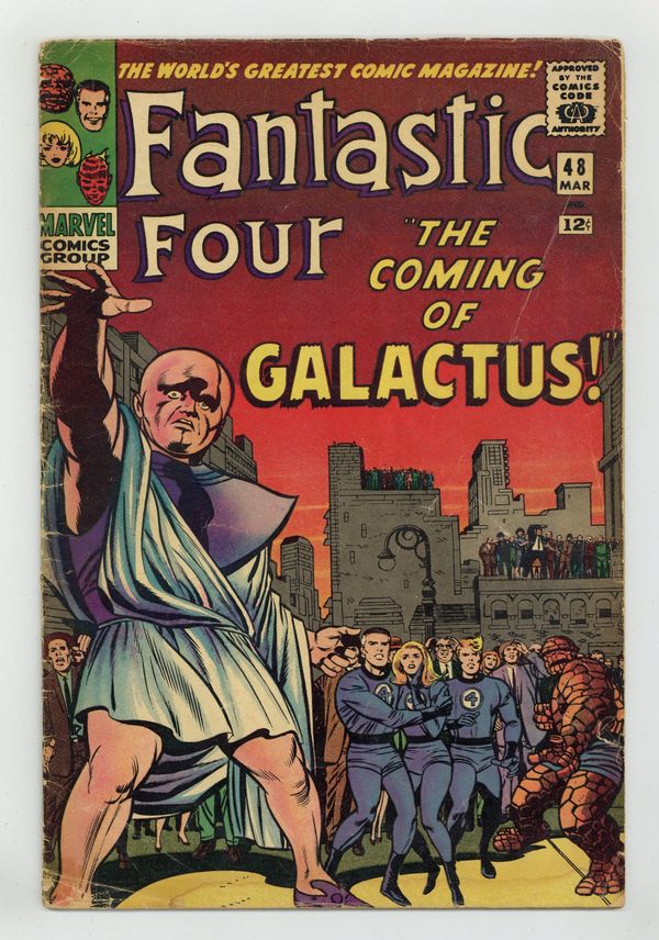 Cover pencils by Jack Kirby, inks by Joe Sinnott. First appearance of Galactus and the Silver Surfer in one of the most famous stories of the Silver Age, The Coming of Galactus!, script by Stan Lee, pencils by Jack Kirby, inks by Joe Sinnott; Black Bolt and the Fantastic Four put an end to Maximus's plan to destroy all the humans; Once the Fantastic Four return to New York the Watcher tells them of the coming danger of Galactus. Letter to the editor from comics writer Don McGregor. 36 pages, full color. Cover price $0.12. Grade: GD+ 2.5 explanation of grade Condition: Used (collectible)
