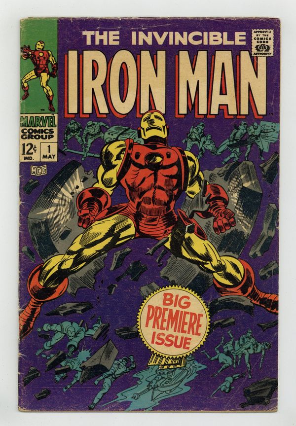 Cover pencils by Gene Colan, inks by Mike Esposito. "Alone Against AIM," script by Archie Goodwin, pencils by Gene Colan, inks by Johnny Craig; Iron Man is captured by A.I.M using a suction beam and trapped in a submarine by orders of Mordius; Meanwhile A.I.M. soldiers are gloating about how they have sunk The Maggias gambling ship and destroyed their leadership; The Golden Avenger is knocked out by gas while back on the sinking Maggia ship Jasper Sitwell is evacuating the passengers; Sitwell stumbles upon Whitney Frost whom he recognises from Stark Industries as one of Tonys admirers; Sitwell rescues Frost and they are taken aboard a S.H.I.E.L.D. helicopter where Nick Fury awaits; When alone Frost reveals herself to be The Big M, leader of The Maggia, and her plan to use Sitwell to learn the secrets of Stark Industries. Continued between Iron Man and Sub-Mariner #1 and Avengers #51. "The Origin of Iron Man," script by Archie Goodwin, pencils by Gene Colan, inks by Johnny Craig; An abridged retelling of Iron Man's origin from Tales of Suspense #39. 36 pgs., full color. $0.12. Cover price $0.12. Grade: GD+ 2.5 explanation of grade Condition: Used (collectible)
