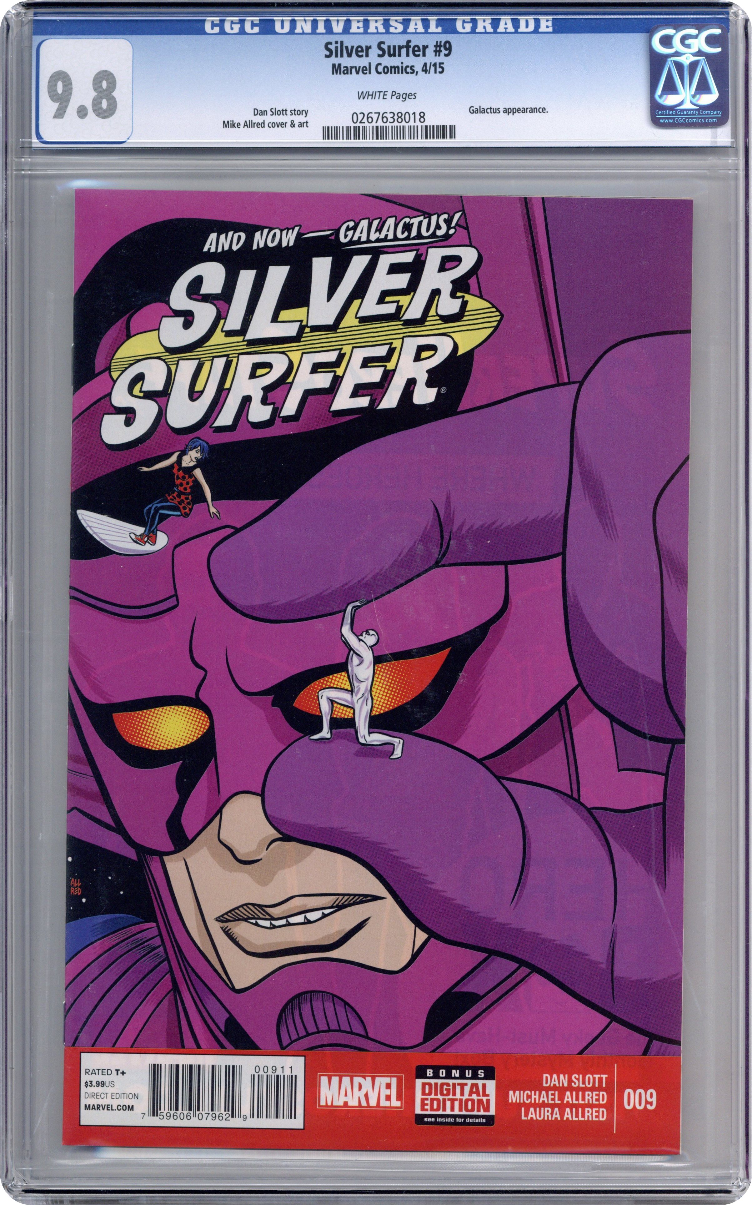 Ended Aug 16 2023 Winning Bid $36 Written by Dan Slott. Art and Cover by Michael Allred. This is the moment everything changes. There is no coming back from this. SILVER SURFER VS. GALACTUS! Don't read this comic alone. You're going to need someone close by. 28 pages, full color. Rated T+ Cover price $3.99. Grade: CGC 9.8 explanation of grade Condition: Used (collectible)