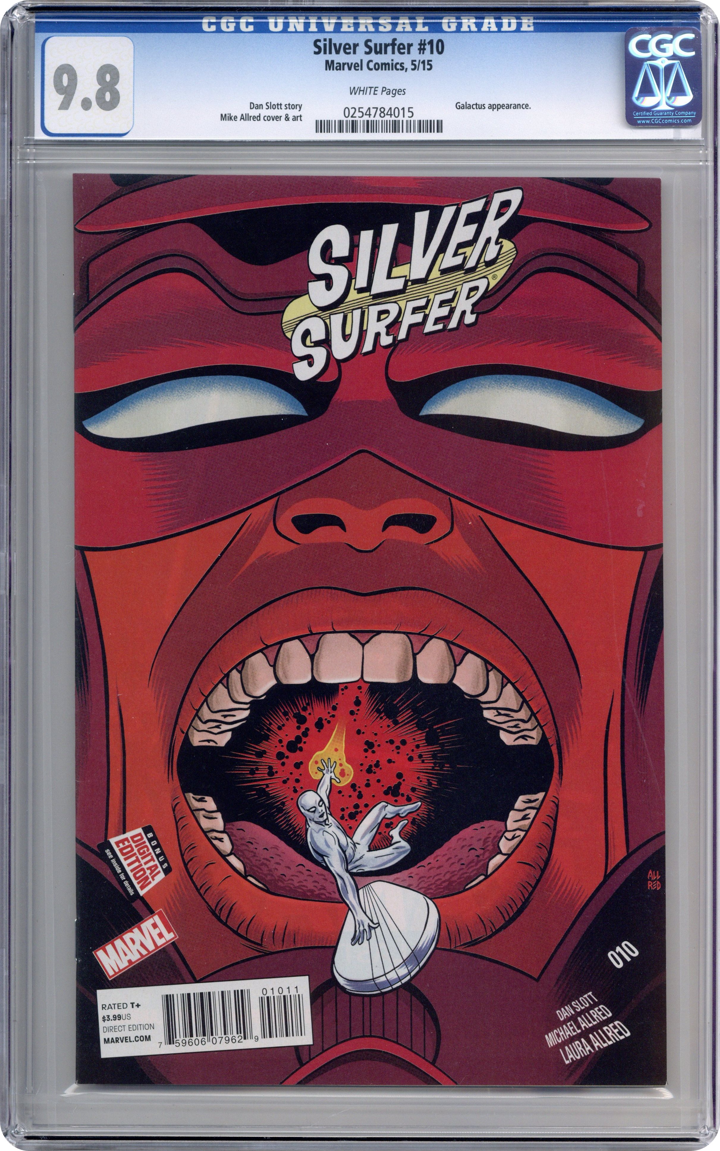 Ended Jul 27 2023 Winning Bid $29 Written by Dan Slott. Art and Cover by Michael Allred. The climax to THE Silver Surfer/Galactus Story for the 21st Century! Witness the soul of the Silver Surfer laid bare in a cosmic clash unlike any you have ever seen! A tale of hope and heroes-- of triumph and tragedy-- as only can be told in one of the Mightiest Marvel Comics of them all! If you weren't a true believer before SILVER SURFER #10, you WILL BE AFTER! 28 pages, full color. Rated T+ Cover price $3.99. Grade: CGC 9.8 explanation of grade Condition: Used (collectible)