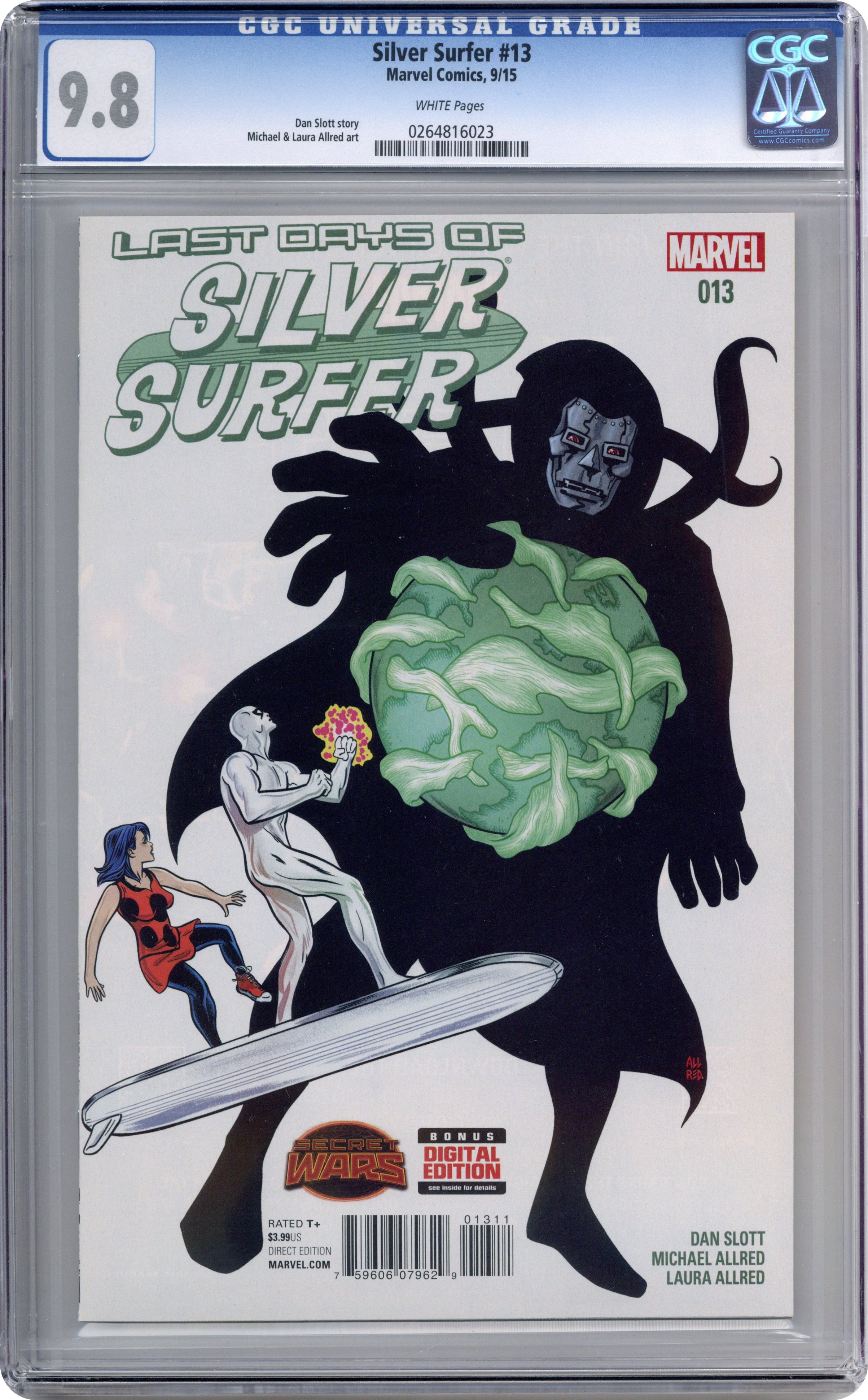 Ended Jun 14 2023 Winning Bid $27 Secret Wars: Last Days - Written by Dan Slott. Art and Cover by Michael Allred. THE LAST DAYS - 'The Death of Everything That Ever Was or Will Be' Time ran out and the Marvel Universe died. From the edge of Battleworld to the outskirts of all infinity, every planet, moon, and star has been expunged. Every life force has been extinguished. There are NO survivors... ...except the Surfer, Dawn, and Toomie. How did they pull this off? And, more importantly, can they figure out a way to bring everything BACK? If you care about the fate and future of the Cosmic corners of the Marvel Universe, you cannot miss this comic! 28 pages, full color. Rated T+ Cover price $3.99. Grade: CGC 9.8 explanation of grade Condition: Used (collectible)