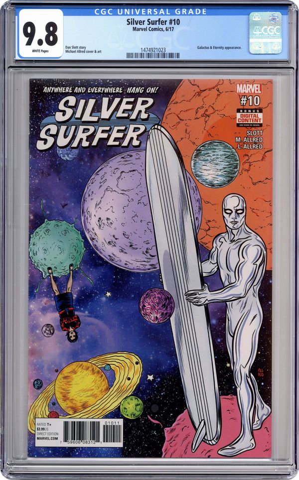 Ended Jul 26 2023 Winning Bid $21 Written by Dan Slott. Art and Cover by Mike Allred. 'Unheralded' There's only one reason the Silver Surfer would ever serve Galactus again... ...if the Universe itself hung in the balance! Will this be the final straw that breaks up Marvel's most cosmic couple? 28 pages, full color. Rated T+ Cover price $3.99. Grade: CGC 9.8 explanation of grade Condition: Used (collectible)