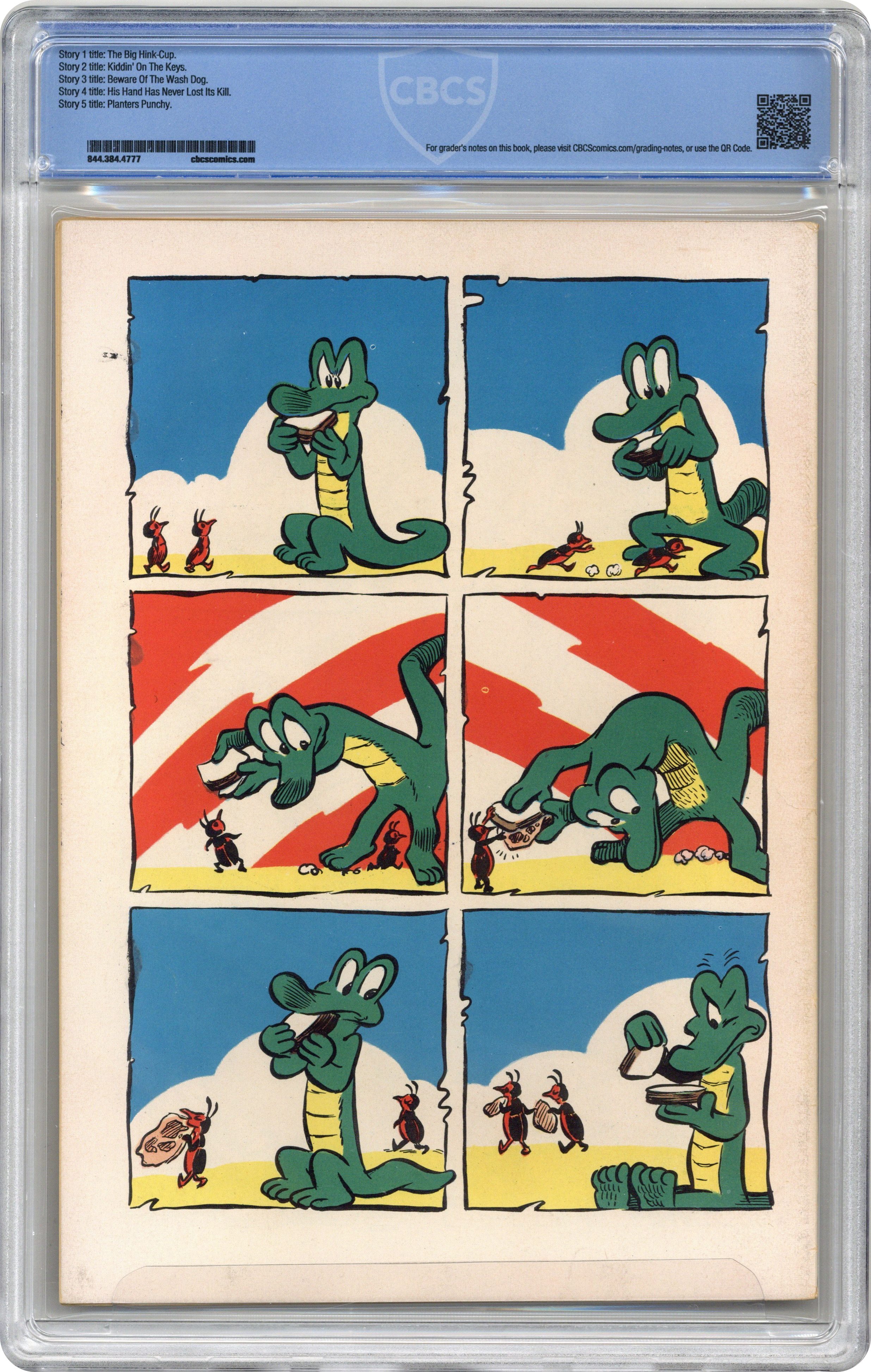 Ended Oct 25 2022 Winning Bid $63 Cover art by Walt Kelly. Scripts and art by Walt Kelly. Untitled one-page story; Churchy chasing butterflies catches Miz Mam'selle's bow. "The Big Hink-Cup"; Pogo and Albert require the help of the fire brigade for the Bunny Boy falling into their cake batter. "Kiddin' on the Keys"; Seminole Sam sells Porkypine an almost self-playing piano with office space inside. "Beware of the Wash Dog"; Howland convinces Albert he can make millions doing washing, and makes him begin at washing Howland's dirty clothing. "His Hand Has Never Lost its Kill"; Albert decides to build a home for the lady bug, and spends seven pages fighting assorted tools. "Planters Punchy"; For Arbor Day Churchy and Rackety Coon Chile decide to plant a tree and try to decide which kind of a hole to put into the ground. Untitled one-page story; A bird keeps stealing Churchy's pancakes. Untitled one-page story; The ants trick Albert out of the contents of his sandwich. 52 pages, full color. Cover price $0.10. Grade: CBCS 5.5 explanation of grade Condition: Used (collectible)