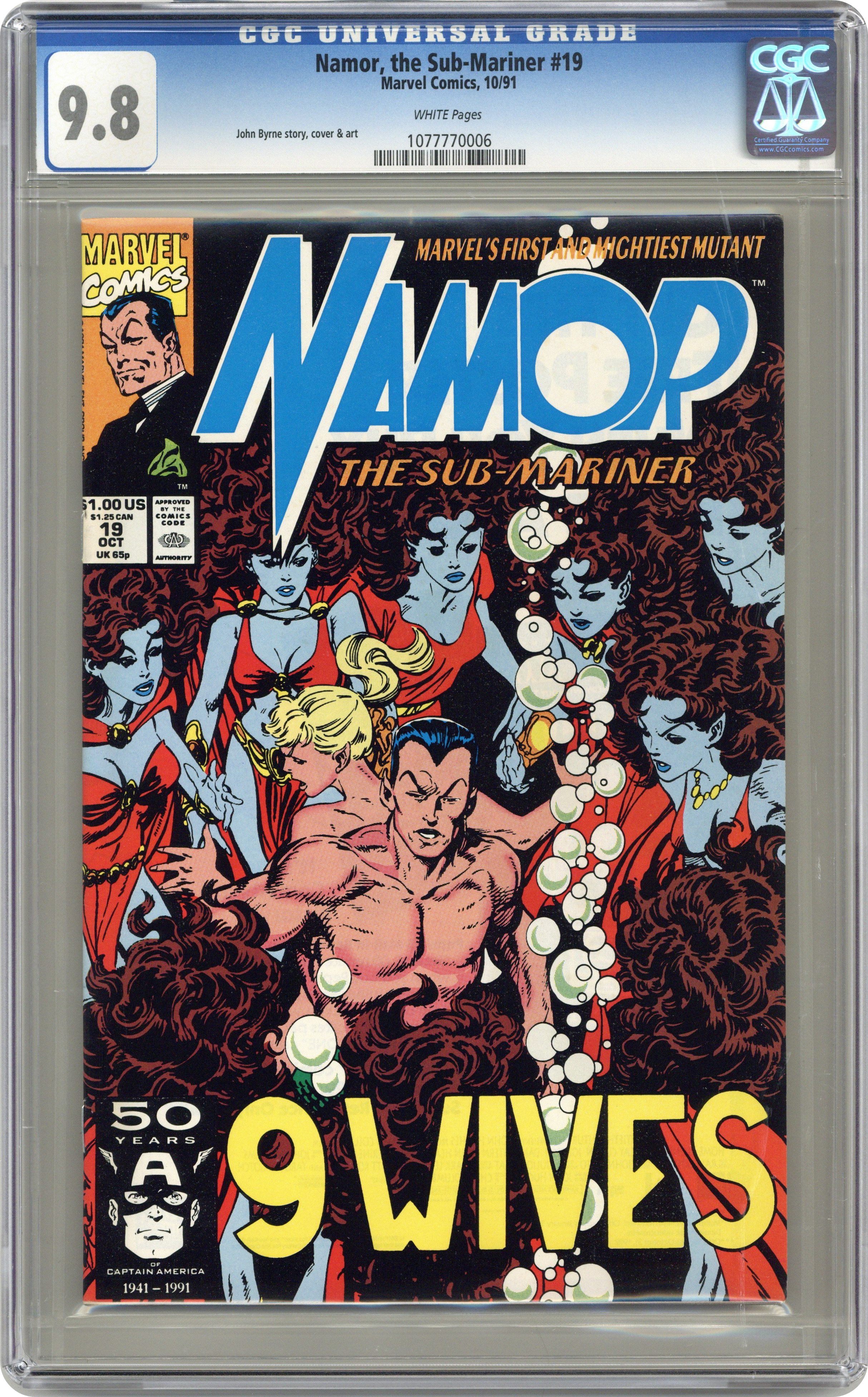 Ended Sep 26 2023 Winning Bid $31 "9 Wives!" Part 1 of 2. Guest-starring the Punisher, Namorita and Spitfire. Shanna the She-Devil cameo. Story, art, and cover by John Byrne. With the mystery of Danny Rand behind him, Namor turns his attentions to discovery the secrets behind the return of Lady Dorma. He soon discovers a shocking revelation about his cousin Namorita. Plus, Desmond Mars faces the justice of the Punisher! Cover price $1.00. Grade: CGC 9.8 explanation of grade Condition: Used (collectible)