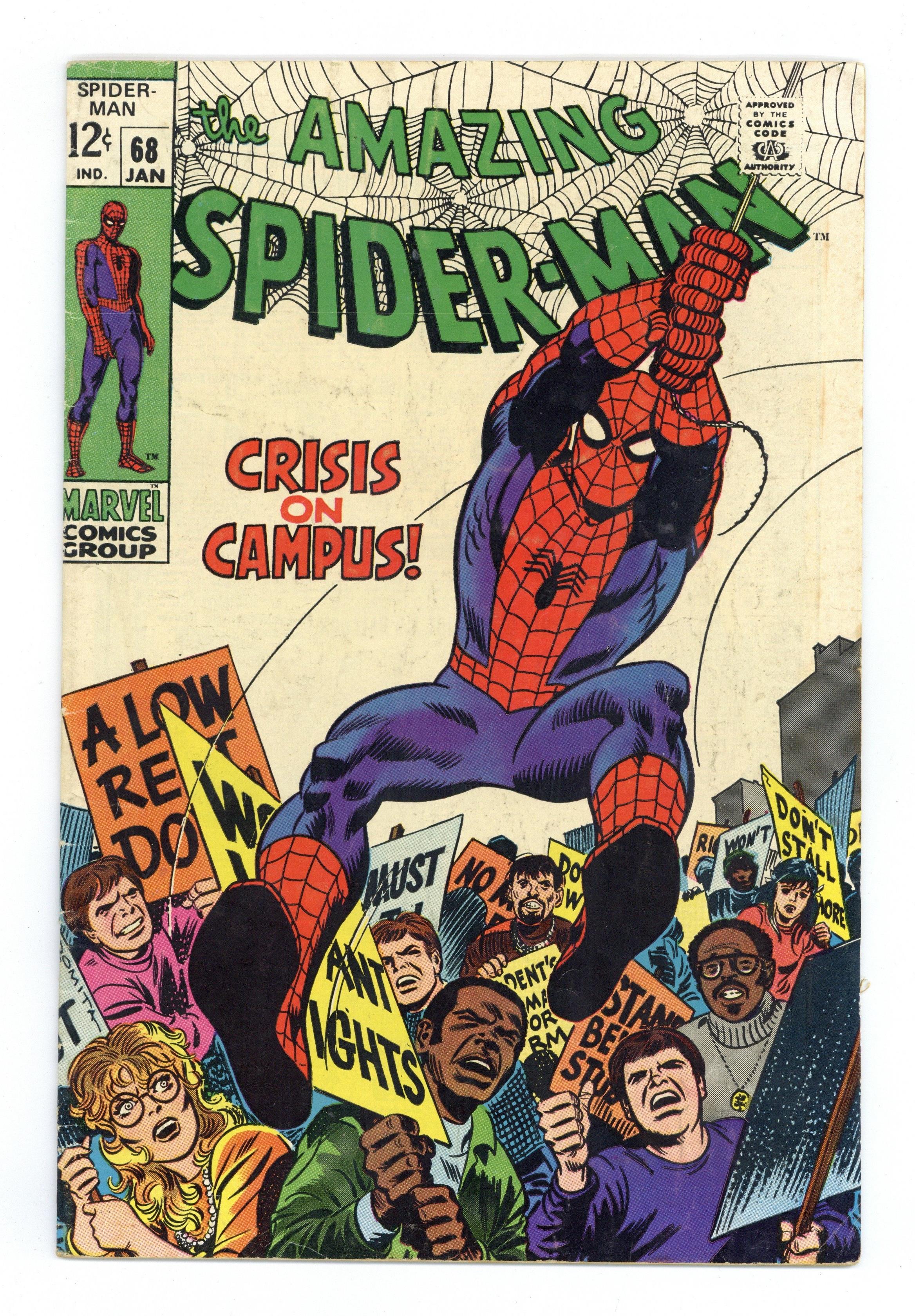 "Crisis on the Campus!" Part 1 of 3. Plot by John Romita. Script by Stan Lee. Art by John Romita (layouts) and Jim Mooney (finishes). Cover by John Romita. The students are restless on the Empire State University campus. The old exhibit hall is being repurposed into an alumni center instead of a low-rent dormitory. And the student body -- including Randy Robertson -- is not happy about it. In the meantime before the exhibit hall closes, it will display one final item: a petrified clay tablet. The priceless tablet is said to hold an ancient secret in its hieroglyphics. And a certain Big Apple crime boss wants the tablet very badly! When the Kingpin learns that student protestors are taking over the exhibit hall, he makes his move to steal the tablet! But the large crime lord doesn't know that Spider-Man's alter ego is a student at ESU. So, when the Kingpin storms the exhibit hall, the web-slinger is right behind him! Can the wall-crawler keep the students safe and the tablet secure...while clashing with the Kingpin? Cameo 36 pgs. appearances by Joe Robertson, J. Jonah Jameson, Gwen Stacy, Aunt May, and Anna Watson. (Note: This story was reprinted in Marvel Tales #51.) 32 pages. Cover price $0.12. Grade: VG- 3.5 explanation of grade Condition: Used (collectible)
