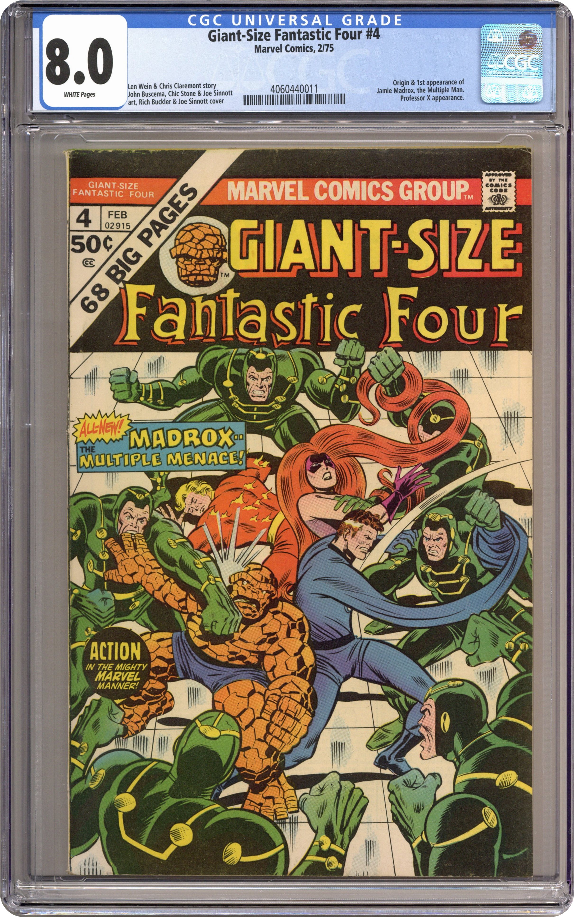 New John Buscema art; 1st appearance of Madrox in "Madrox the Multiple Man!" Guest-starring Professor Xavier. Story by Len Wein and Chris Claremont. Art by John Buscema, Chic Stone, and Joe Sinnott. Ben Grimm and Alicia Masters are on their way to a Jets football game when they encounter the mysterious Madrox! First appearance and origin of Madrox. Fantastic Four members: Mr. Fantastic, Human Torch, Medusa, and the Thing. Back up story: Reprint of Fantastic Four 28 (1st series). The FF's first meeting with the X-Men. This issue also contains a 7-page rogues' gallery of famous FF foes. The letters page includes a letter from comics publisher Dean Mullaney. The letters page also contains Marvel Value Stamp series A #2 the Hulk by Herb Trimpe. 64 pages Cover price $0.50. Grade: CGC 8.0 explanation of grade Condition: Used (collectible)