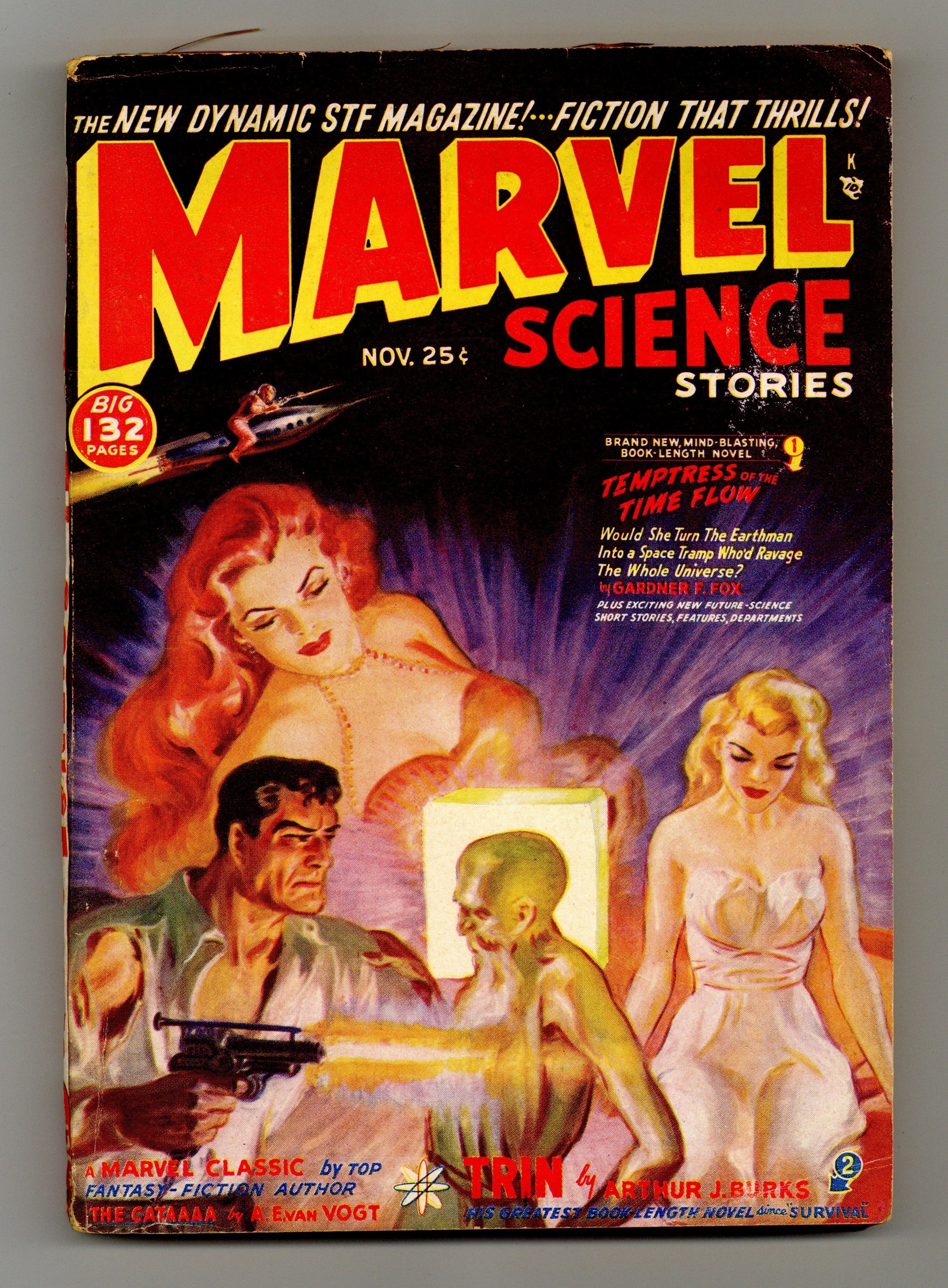 Vol. 3, No. 1 - November 1950. Formerly Marvel Stories. Cover by Norman Saunders. Science Fiction Stories: "Trin" by Arthur J. Burks, "Temptress of the Time Flow" by Gardner F. Fox, "Overlord of Earth" by Lloyd Arthur Eshbach, "Firebrand!" by A. Bertram Chandler, "The Cataaaa" by A. E. Van Vogt, "The Guinea Pig" by Cedric Walker, "The Day They Landed" by Paul Chadwick, plus other editorial features. Illustrations by F.R. Paul and V. Napoli. Softcover Pulp, 6 1/2-in x 9 1/4-in, 134 Pages, B&W. NOTE: See Marvel Science Stories (1938-1939 Postal Publications) Pulp 1st Series; Marvel Tales (1939-1940 Western Fiction) Pulp; and Marvel Stories (1940-1941 Western Fiction) Pulp for earlier issues. Cover price $0.25. Grade: VG 4.0 explanation of grade Condition: Used (collectible)