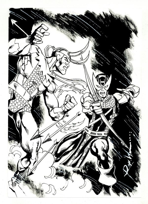Hawkeye vs. Loki Sketch by Ron Williams. Signed by the artist. Pencil and ink on art stock. 7" x 10", B&W.