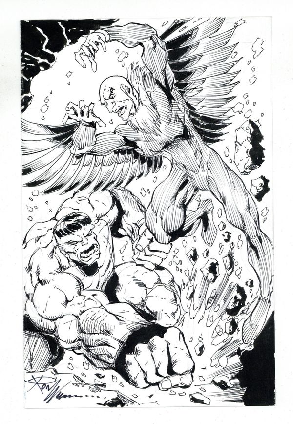 Hulk vs. Vulture Sketch by Ron Williams. Signed by the artist. Pencil and ink on art stock. 5 1/2" x 8 1/2", B&W.