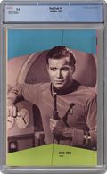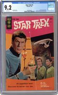 Comic book version of the original Star Trek TV series that starred William Shatner and Leonard Nimoy. Photo cover of Leonard Nimoy, William Shatner, & George Takei. Photo of U.S.S. Enterprise inside front cover. Note: There is ONLY one version of this issue. It has a photo of William Shatner on the back cover. There is no version of this issue with an ad on the back. "The Planet of No Return," script by Dick Wood, art by Nevio Zeccara; An expedition team discovers its secret too late... K-G, Planet of Death!; The planet K-G is a plant dominated planet that sends out spores that change mammals into plants; They also eat mammals; The crew beams down five crewmen and you never know who will make it because no one wears red. 36 pgs., full color. $0.12. Cover price $0.12. Grade: CGC 9.2 explanation of grade Condition: Used (collectible)