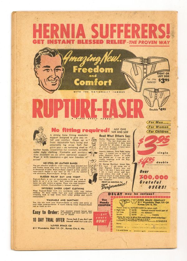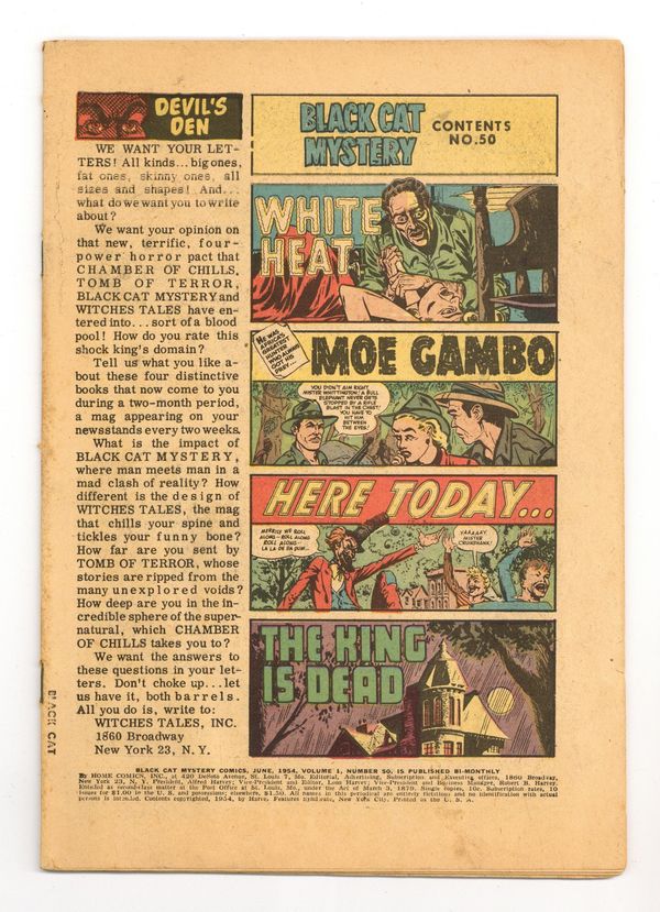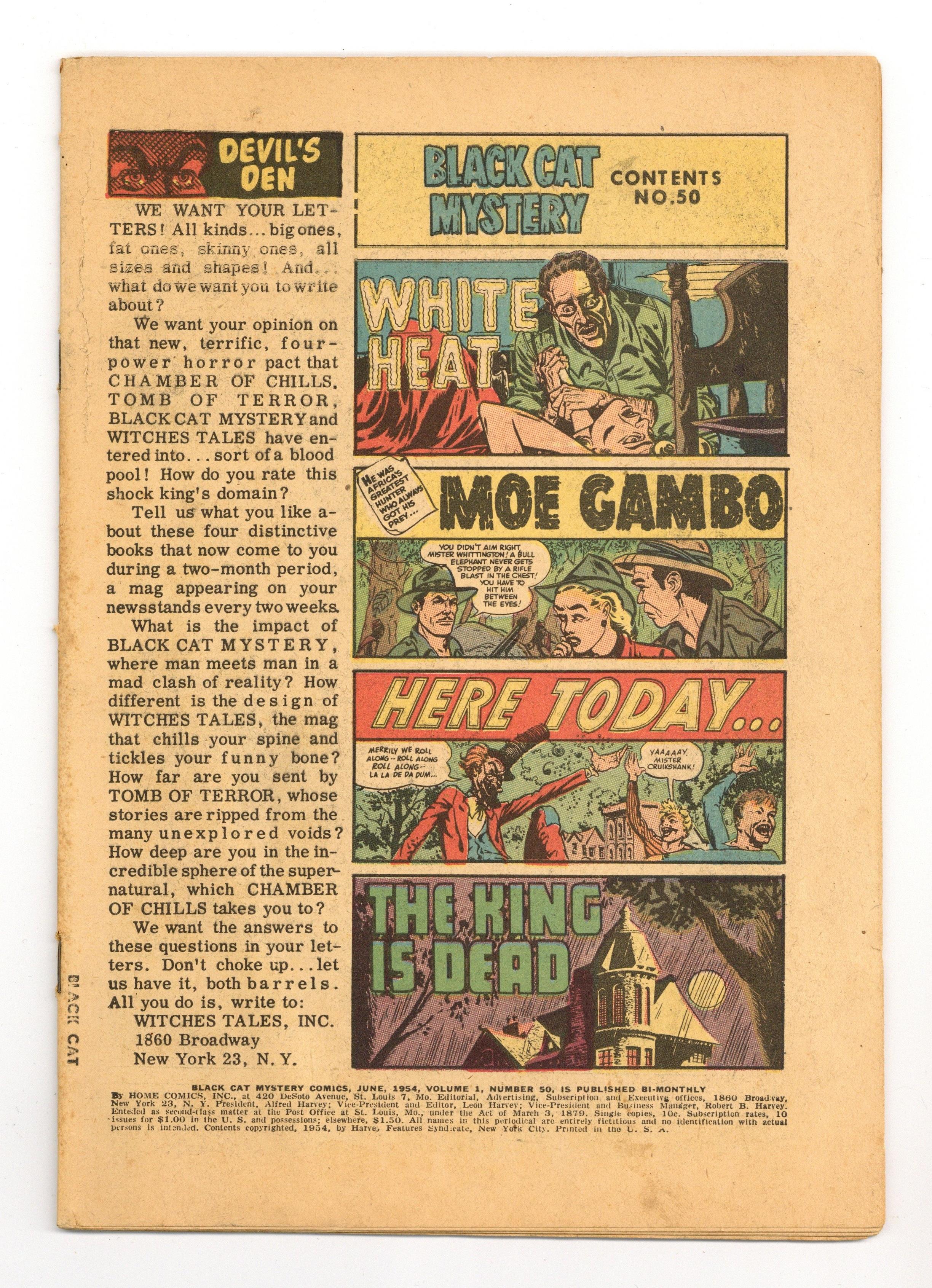 Cover by Lee Elias. Stories and art by Bob Powell, Howard Nostrand, Manny Stallman, John Giunta Joe Certa, John Belfi, Sid Check and Frank Frazetta. Former superhero comic Black Cat becomes a showcase for Harvey's unique brand of pre-Code horror. A man is stealing corpses form the cemetery, and the townspeople want to know why. A dark spoof of the movie Mogambo, an experiment in the Mad-style humor that resulted in Harvey's short-lived comic Flip. A mysterious visitor to a small town has plans of revenge against the town elders, in a story with early inking assists by fantasy art legend Frank Frazetta. Notorious pre-Code cover by Lee Elias, showing a man's face and hands burning away, is one of the most famous of the era. The King Is Dead; The Artificial Sky; Occupation; Moe Gambo; White Heat; And Still Champion; Torture!; Here Today…. 36 pages, full color. Cover price $0.10. Grade: Coverless explanation of grade Condition: Used (collectible)
