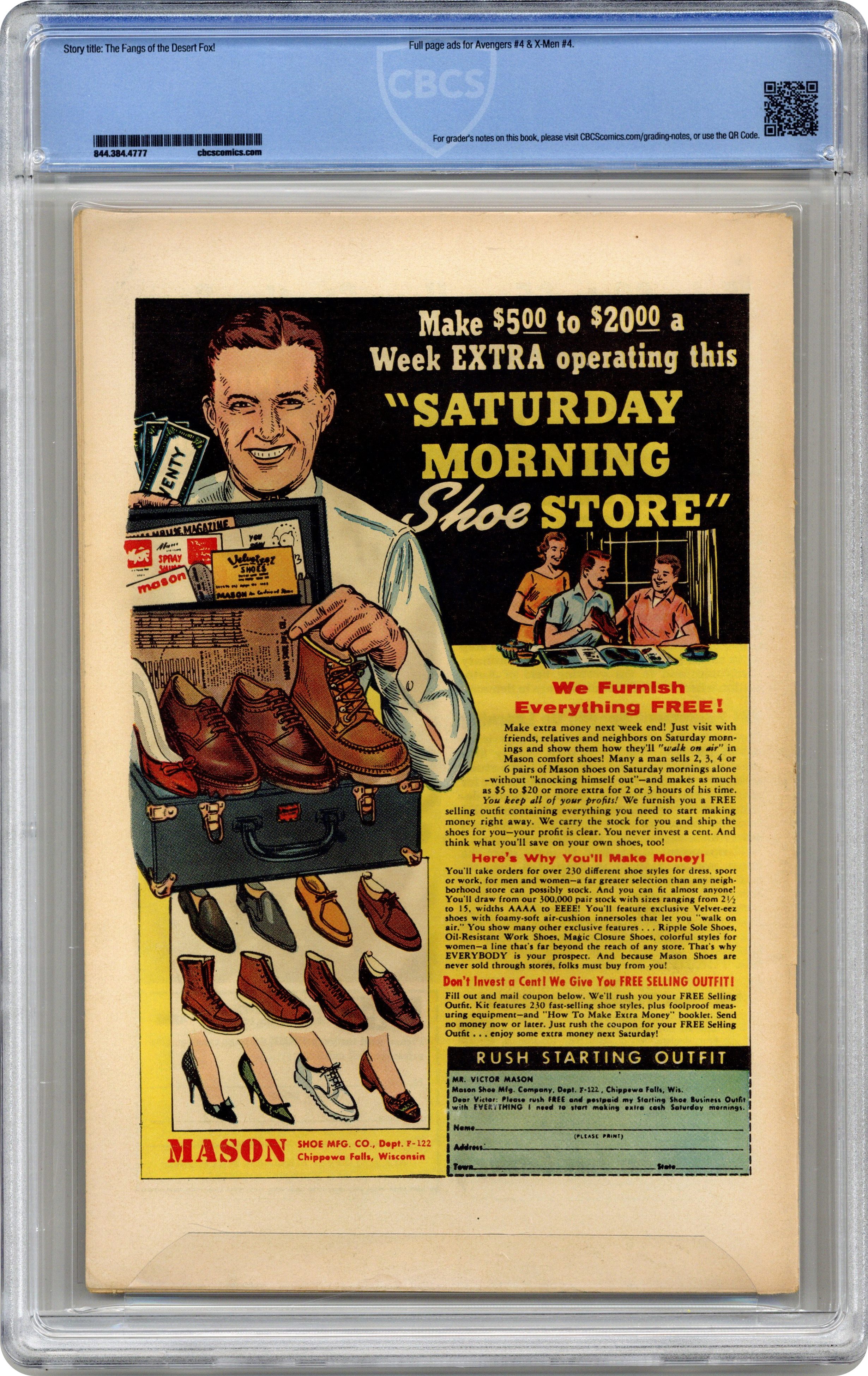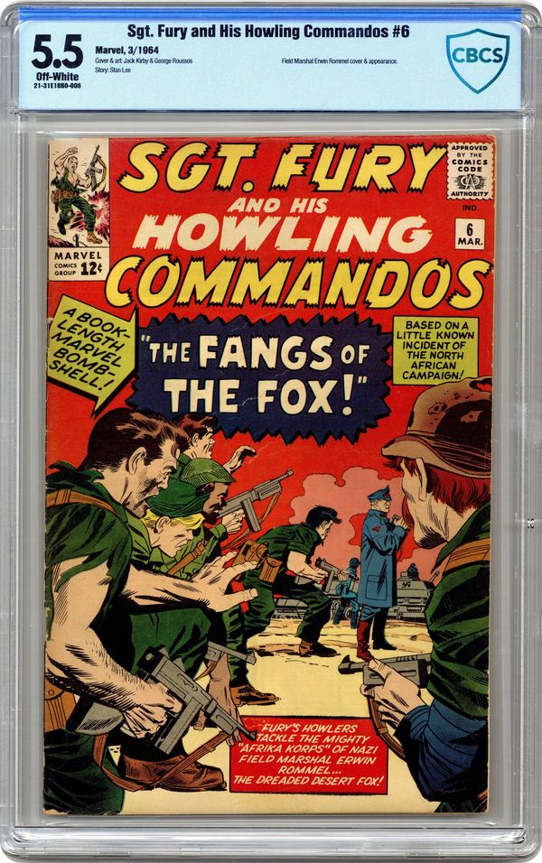 Ended Nov 16 2022 Winning Bid $49 Cover pencils by Jack Kirby, inks by George Roussos. The Fangs of the Desert Fox, script by Stan Lee, pencils by Jack Kirby, inks by George Roussos; While Dino Manelli is recuperating from an injury, Fury is ordered to attack Rommel. But Manelli is replaced by George Stonewell, a bigot who may have trouble with some of the commandos. 36 pgs. $0.12. Cover price $0.12. Grade: CBCS 5.5 explanation of grade Condition: Used (collectible)