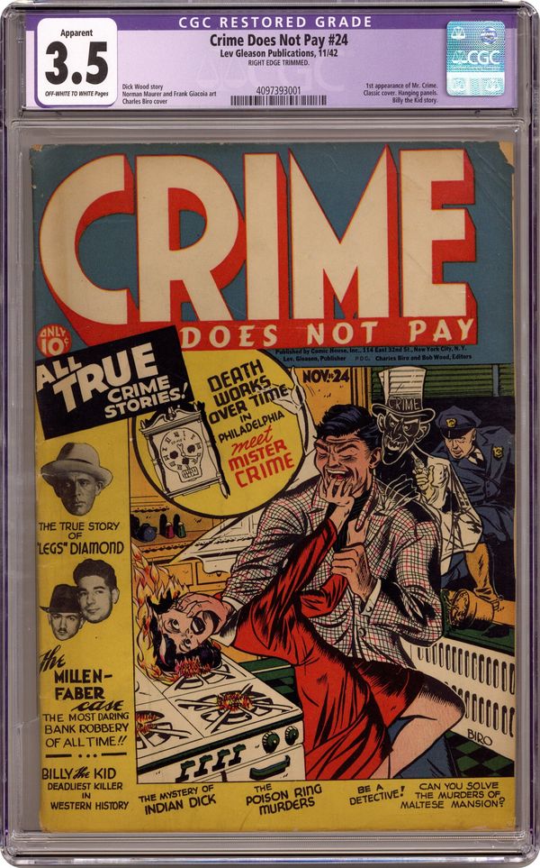 Cover by Charles Biro. Stories and art by Dick Briefer, Woody Hamilton, Dick Wood, Bart Tumey, Buriokoff, Alan Mandel, Norman Maurer, Frank Giacoia and Charles Biro. The title that launched the crime comics genre, Crime Does Not Pay was noted for its violent pre-Code content and lurid tales of underworld life. The first appearance of spectral story host Mr. Crime, as he relates the rise and fall of Prohibition gangster Legs Diamond. The chilling true tale of the Philadelphia poison ring, in which gangsters killed unsuspecting victims for insurance payouts. Wild West gunfighter and outlaw Billy the Kid dies at age 21, but not before becoming a legend. The True Story of Jack Legs Diamond; The Mystery of Indian Dick and the Phantom Gold Mine; His Mothers Ghastly Vision; Death Works Overtime!!: The True Story of Philadelphias Poison Ring; The Amazing Mystery of the Murders of Maltese Mansion; The Strange Case of the Four-Legged Witness; Billy the Kid; Corpses for Sale; The Millen-Faber Case. 68 pages, Full Color. Cover price $0.10. Grade: CGC 3.5 explanation of grade Condition: Used (collectible)
