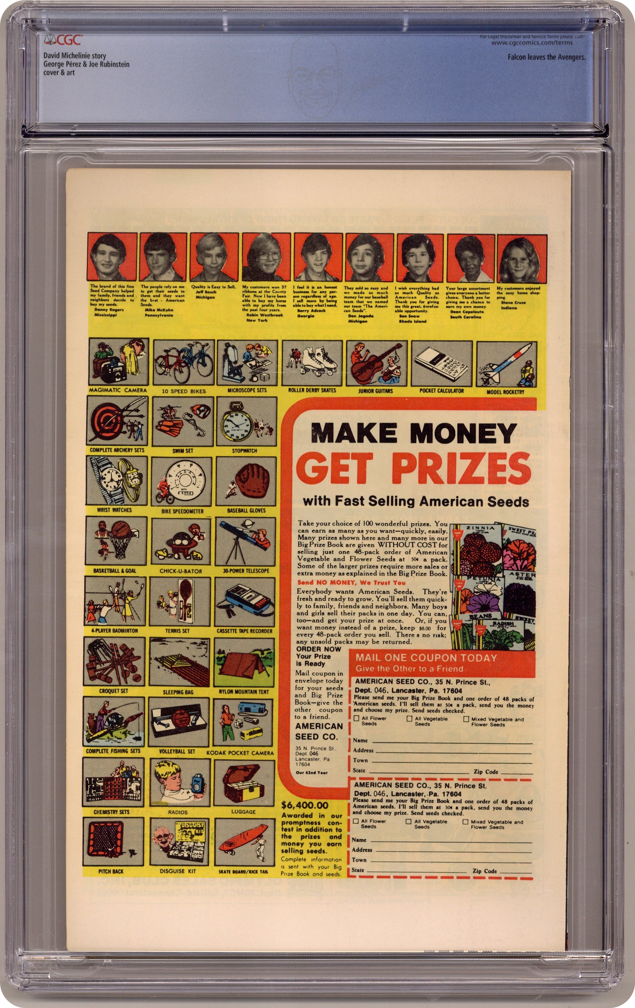 Ended Feb 18 2024 Winning Bid $37 Direct Edition. "Interlude!" Script by David Michelinie. Pencils by George Perez. Inks by Joe Rubinstein. Cover by George Perez and Joe Rubinstein. After their adventure in Pittsburgh last issue, Earth's Mightiest Heroes take some time off to get their affairs in order at Avengers Mansion. Wonder Man rejoins the group and the Falcon departs. The quiet afternoon is interrupted by a troubled man's arrival at the front door in desperate need of help. Apparently the gentleman has just escaped from an insane asylum. Most of the avengers except for the Wasp think the confused man is just making up a story about the Solomon Institute. But could he actually be speaking the truth? Meanwhile, the Vision grows restless and introspective during Wanda's leave of absence from the team. 36 pgs. Cover price $0.40. Grade: CGC 9.6 explanation of grade Condition: Used (collectible)