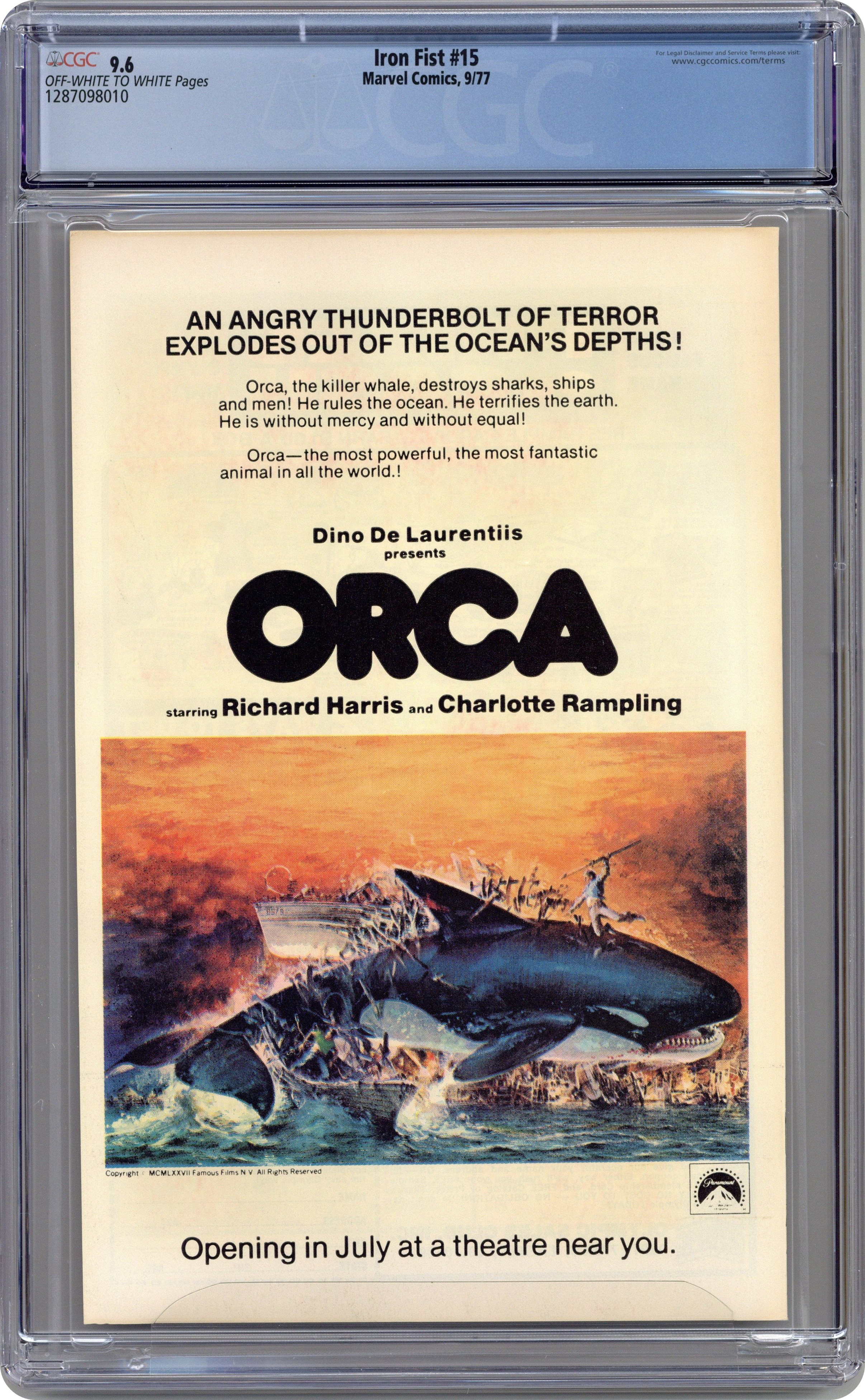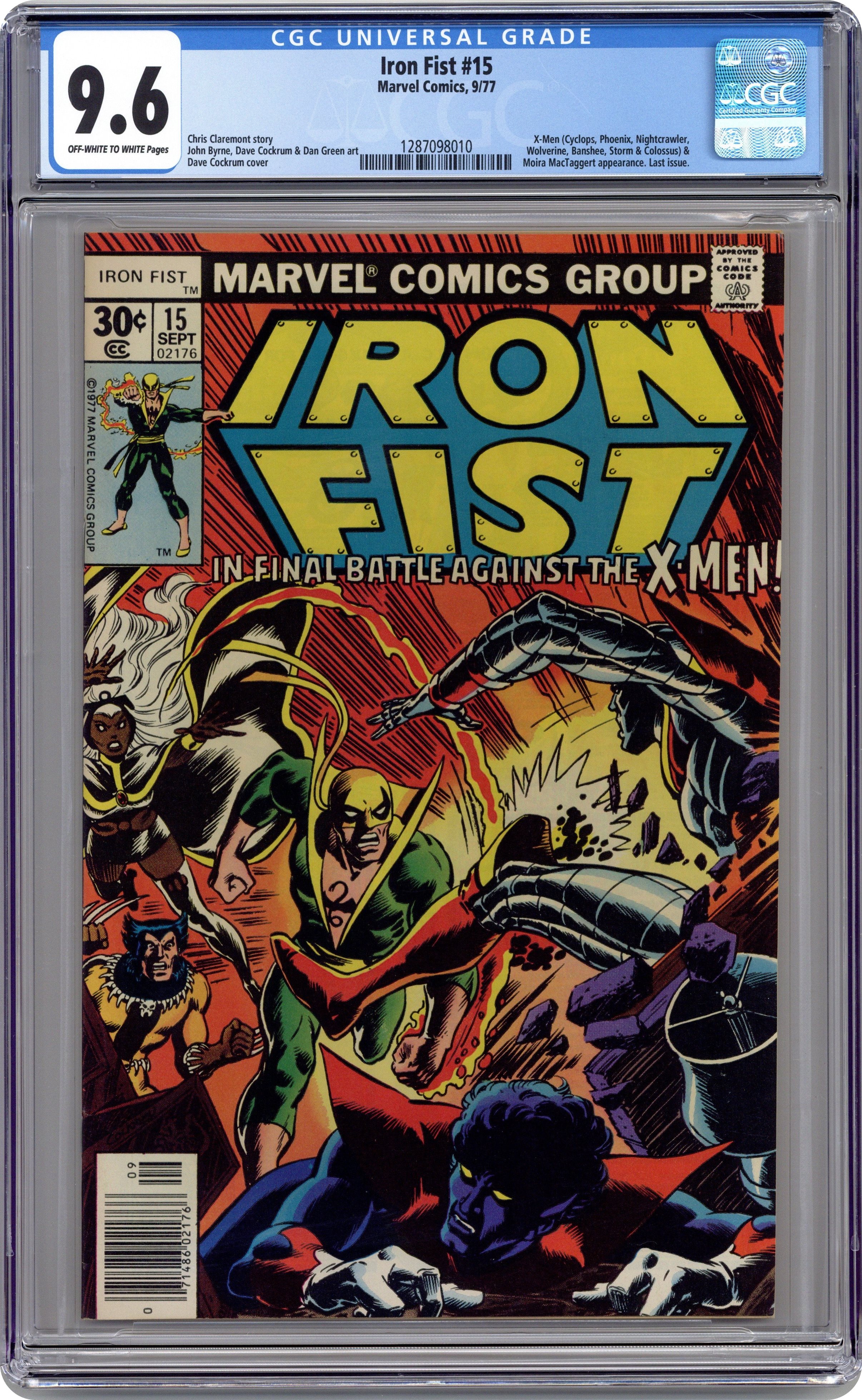 Final issue. 1st appearance of Bush Master. "Enter the X-Men!" Guest-starring the Uncanny X-Men and Misty Knight. Story by Chris Claremont. Art by John Byrne and Dan Green. Cover by Dave Cockrum. Danny arrives at Misty Knight's apartment to find his friend missing However, this apartment also belongs to one Jean Grey, and a misunderstanding has Iron Fist in pitch battle against the Uncanny X-Men. Meanwhile, Misty Knight is deep undercover infiltrating the organization of none other than Bush Master (Power Man's erstwhile foe)! The subplot of the dragon branded bruiser that has ambushed Iron Fist is wrapped up in Marvel Team-up #63-64, and Iron Fist's further adventures continues in Power Man and Iron Fist #48. Cover price $0.30. Grade: CGC 9.6 explanation of grade Condition: Used (collectible)