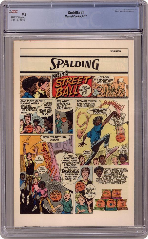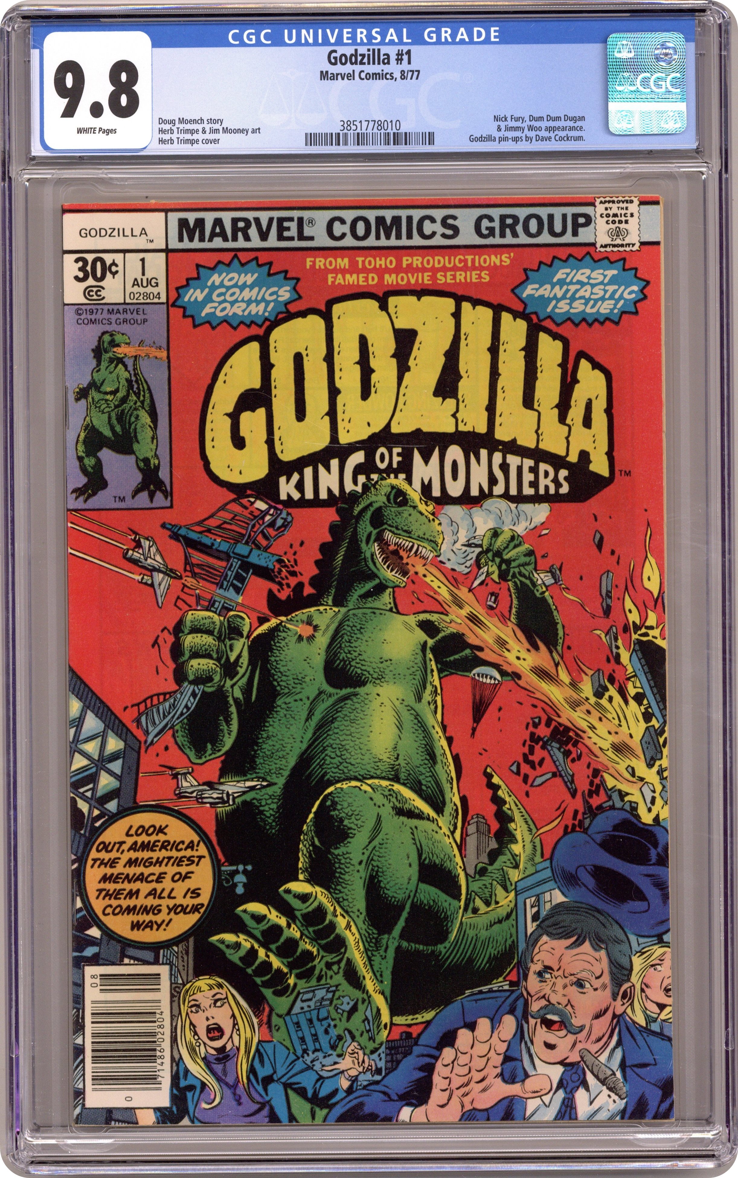 "The Coming!" Guest-starring Nick Fury and S.H.I.E.L.D. Story by Doug Moench. Art by Herb Trimpe and Jim Mooney. The slumbering leviathan known as Godzilla has awaken and rises out of the sea off the shores of Alaska. This reptilian titan has already left Japan devastated and now has made his way to America. With a tail that can smash mountains to dust and fiery breath born out of the Atomic Age, is there anything that can stop this monster's rampage? Right from the Toho Productions' famed movie series comes Godzilla, King of the Monsters. Cover price $0.30. Grade: CGC 9.8 explanation of grade Condition: Used (collectible)