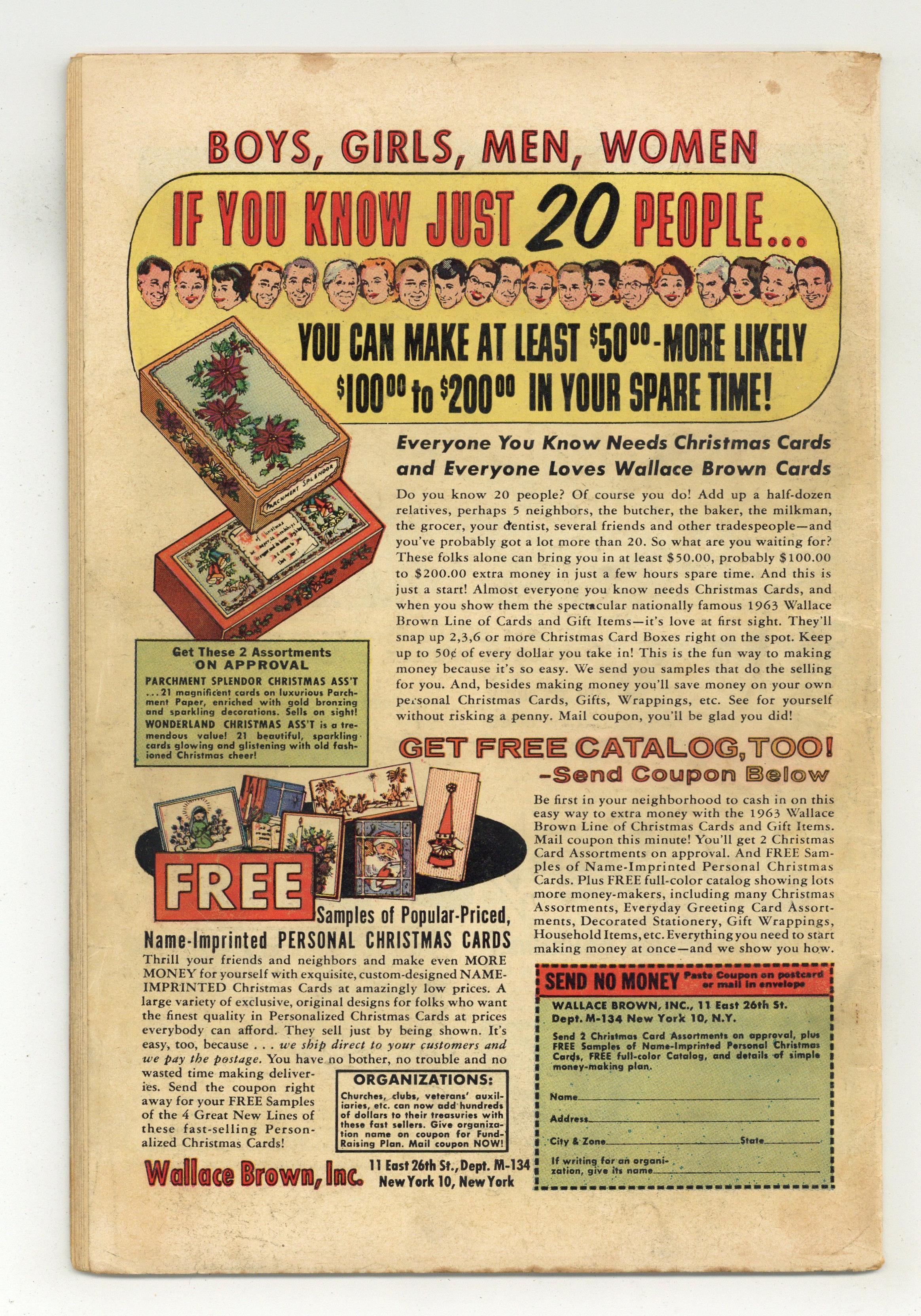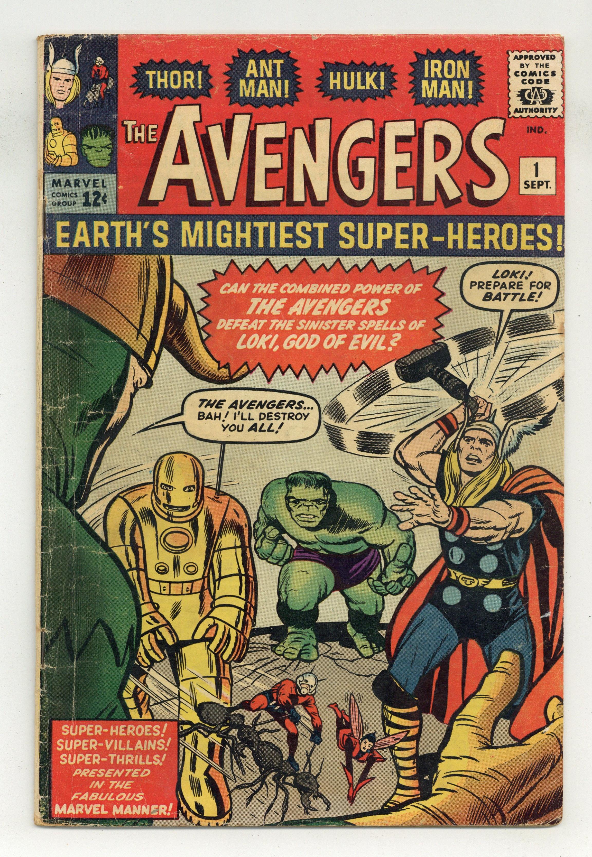 Cover pencils by Jack Kirby, inks by Dick Ayers. In this first landmark issue, Thor, Hulk, Iron Man, and Ant Man form the Avengers in "The Coming of the Avengers!", script by Stan Lee, pencils by Jack Kirby, inks by Dick Ayers; Loki, having been previously captured by Thor, is being held prisoner at the Isle of Silence in Asgard; His physical form may be confined there, but by means of thought projection his disembodied self travels to Earth in search of revenge; He spots Thor in his human identity of Dr. Don Blake, but resists defeating him as it would be a hollow victory compared to defeating him as Thor; After hours of searching, Loki happens across the Hulk and devises a wicked plan to entice Blake to transform into Thor; Hours later, newspapers print articles about the Hulk being on the rampage again and a manhunt begins; The Hulk's friend, Rick Jones, reads the article with disbelief and meets with members of the Teen Brigade in order to find help to track Hulk down to find the truth; They attempt to contact the Fantastic Four but Loki interferes with the radio signal, diverting it to Don Blake; He decides to transform into Thor to help the Teen Brigade; Unknown to Loki, the radio signal is also picked up by Ant-Man, the Wasp, and Iron Man, who also travel to assist; Iron Man, Ant-Man and the Wasp pursue the Hulk to an auto factory in Detroit; Thor appears with Loki to clear Hulk's name; Suddenly Loki makes himself radioactive forcing the heroes to retreat; Luckily, Loki stands over a trapdoor and Ant-Man's ants trigger a switch, dropping him into a lead-lined tank; Upon celebrating their victory, Ant-Man and the Wasp point out how well they could work as a team, and that they should work together in future; The Wasp decides they should call themselves the Avengers, and everybody agrees. 36 pgs., full color. $0.12. Cover price $0.12. Grade: GD/VG 3.0 explanation of grade Condition: Used (collectible)