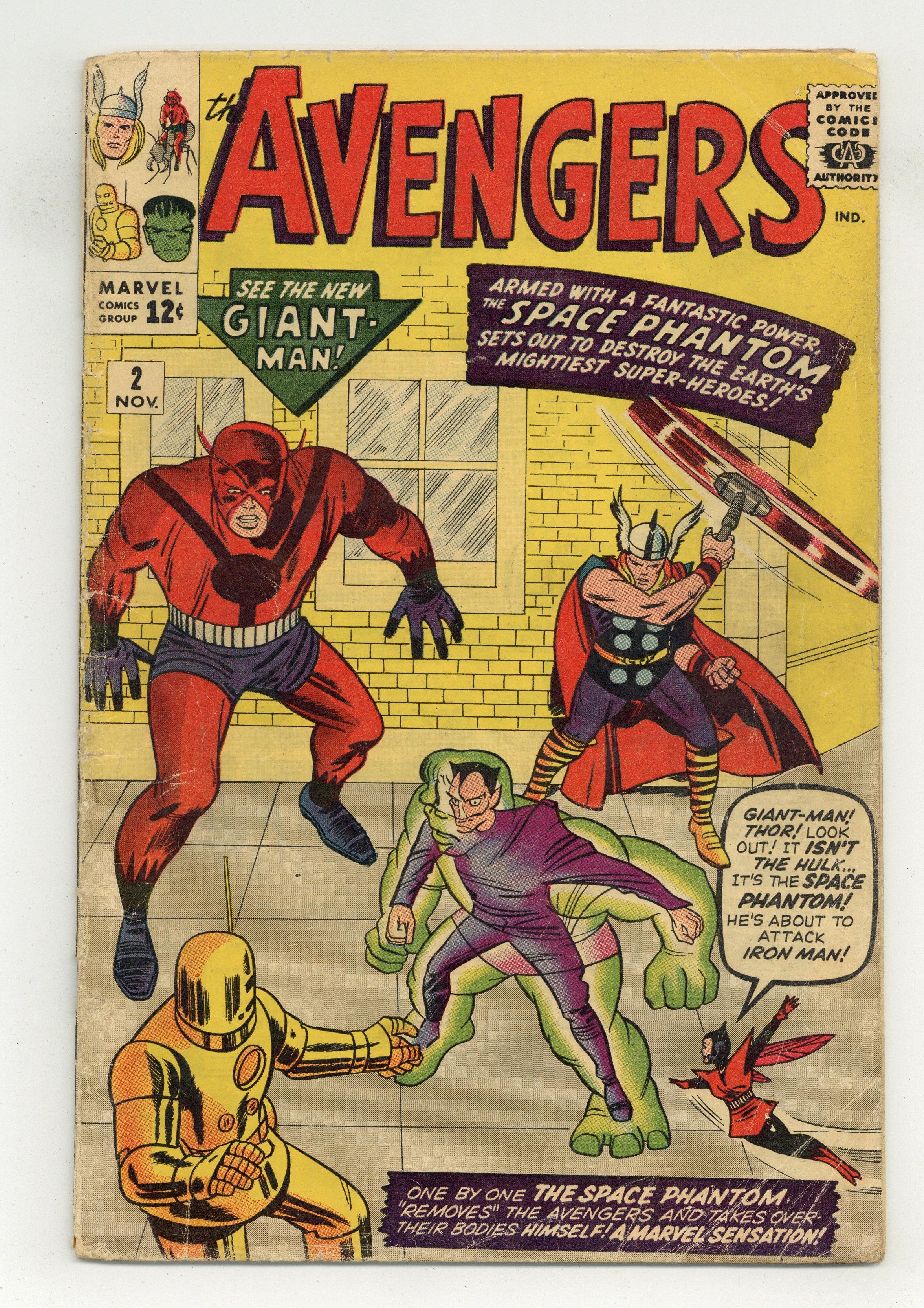 Cover pencils by Jack Kirby, inks by Sol Brodsky. The Avengers Battle the Space Phantom, script by Stan Lee, pencils by Jack Kirby, inks by Paul Reinman; The Space Phantom comes to Earth to defeat the Avengers; If he can, then nothing can stop his race from invading Earth. Roster includes Thor, Iron Man, Wasp, Giant Man, and the Hulk, who leaves the team at the end of the issue. Rick Jones appearance. First appearance of the Avengers Mansion. 36 pgs. $0.12. Cover price $0.12. Grade: GD 2.0 explanation of grade Condition: Used (collectible)