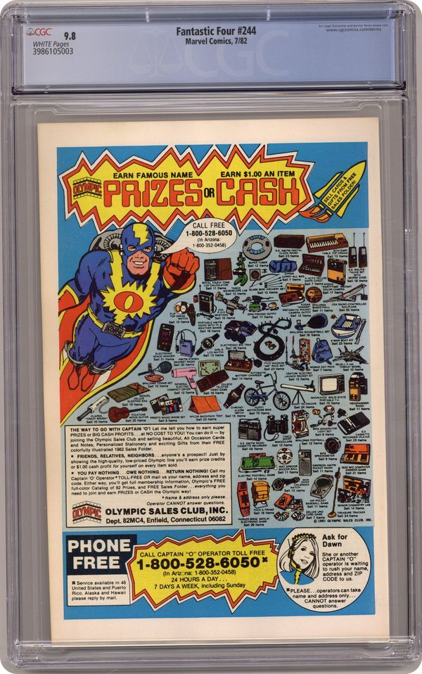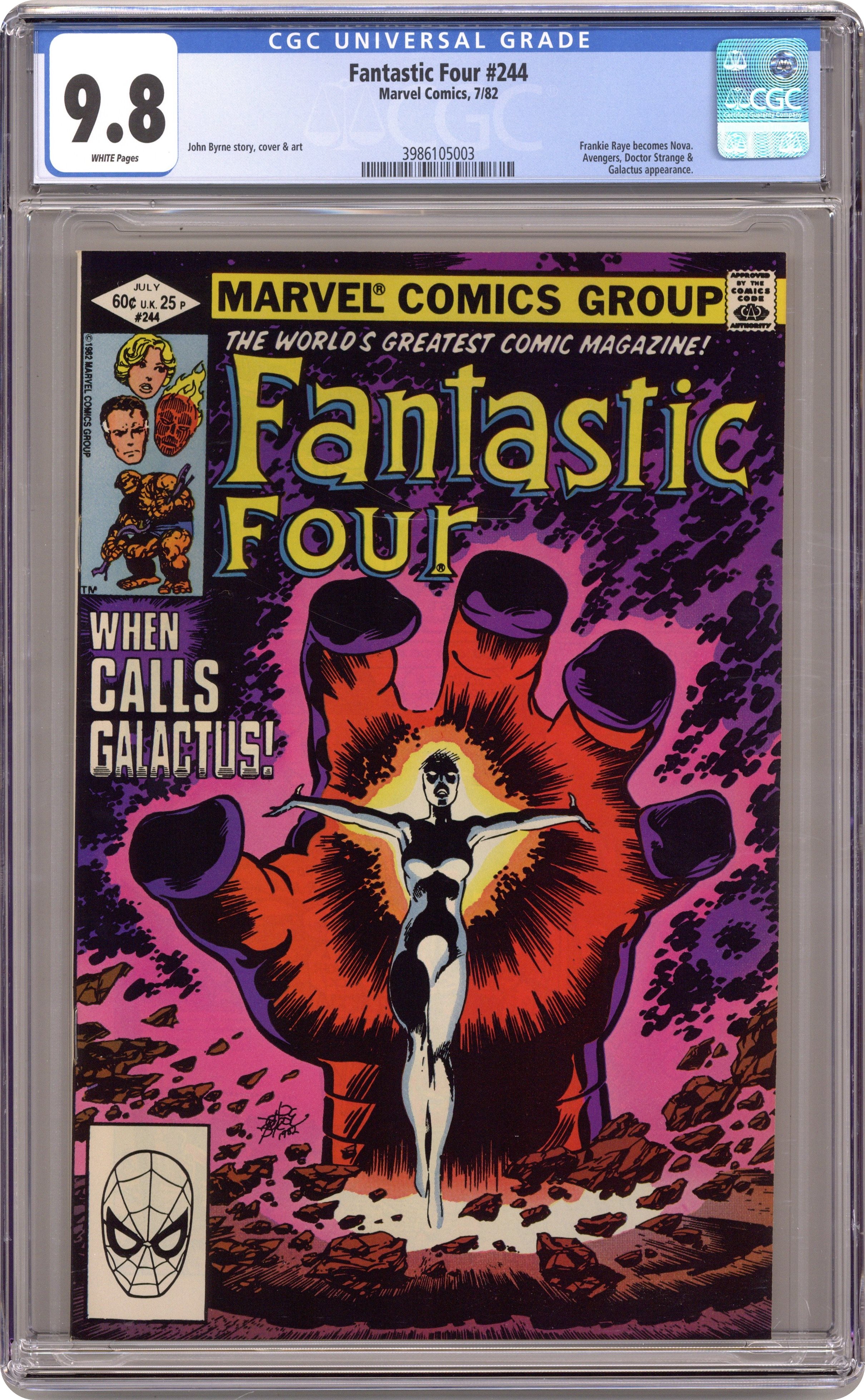 Direct Edition. "Beginnings and Endings" Part 3 of 3. Script and Art by John Byrne. Cover by John Byrne. After an unprecedented victory over Galactus, the Avengers and the Fantastic Four face a major ethical decision: should they try to save the Ravager of Worlds or let him perish as his energies dwindle? Reed decides on the former and constructs a giant machine to revitalize Galactus! However, the Devourer of Worlds needs one more thing to complete his recovery...a new herald! In a stunning move, Frankie Raye volunteers! So where does that leave the Human Torch? First appearance of Nova (aka Frankie Raye). Cameo appearances by Captain America, Iron Man, Thor, Wasp, and Doctor Strange. (Notes: This trilogy was reprinted in 1989 in the trade paperback titled "Fantastic Four: Trial of Galactus." Reed's decision to save Galactus will come back to haunt the FF beginning in Fantastic Four 257.) 36 pages Cover price $0.60. Grade: CGC 9.8 explanation of grade Condition: Used (collectible)
