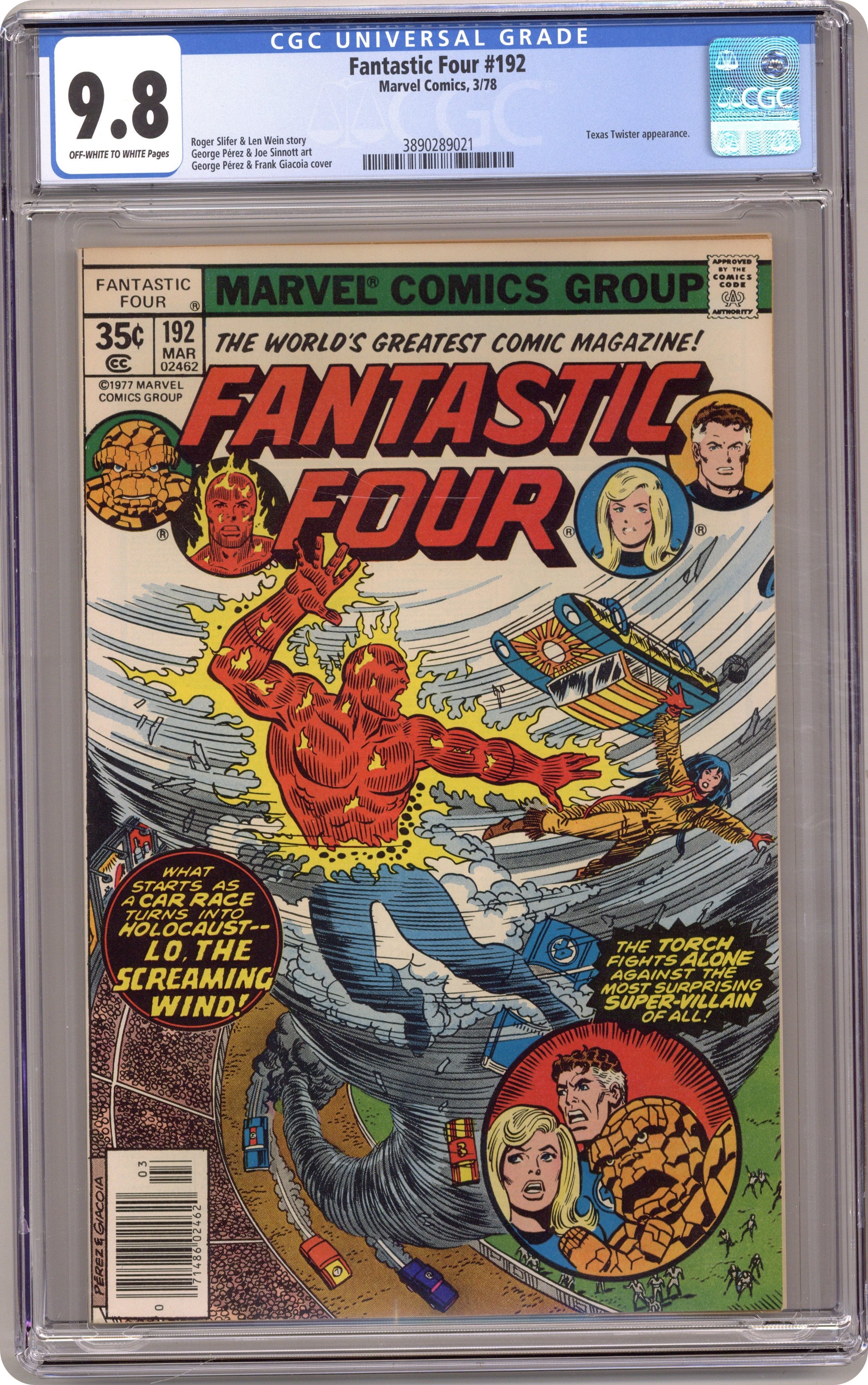 "He Who Soweth The Wind...!" Plot by Len Wein. Written by Roger Slifer. Pencils by George Perez. Inks by Joe Sinnott. Cover by George Perez and Frank Giacoia. Johnny Storm heads out west to compete in a motor sports drag race! Johnny is running in 2nd place when suddenly the Texas Twister strikes! The Human Torch and his long-time friend, Wyatt Wingfoot, team up to take down the Twister! The letters page includes a statement of ownership: average print run 419,544; average paid circulation 194,661. 36 pgs. Cover price $0.35. Grade: CGC 9.8 explanation of grade Condition: Used (collectible)