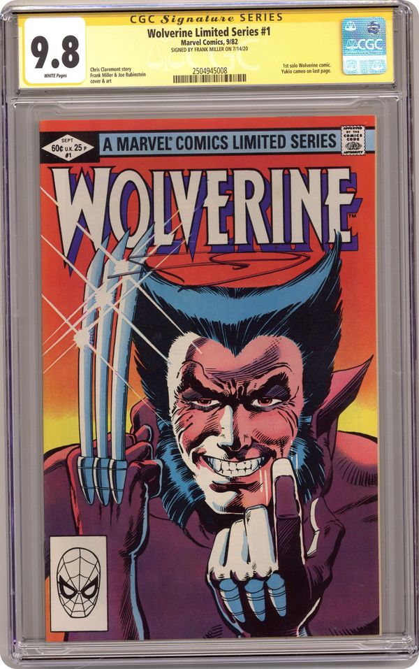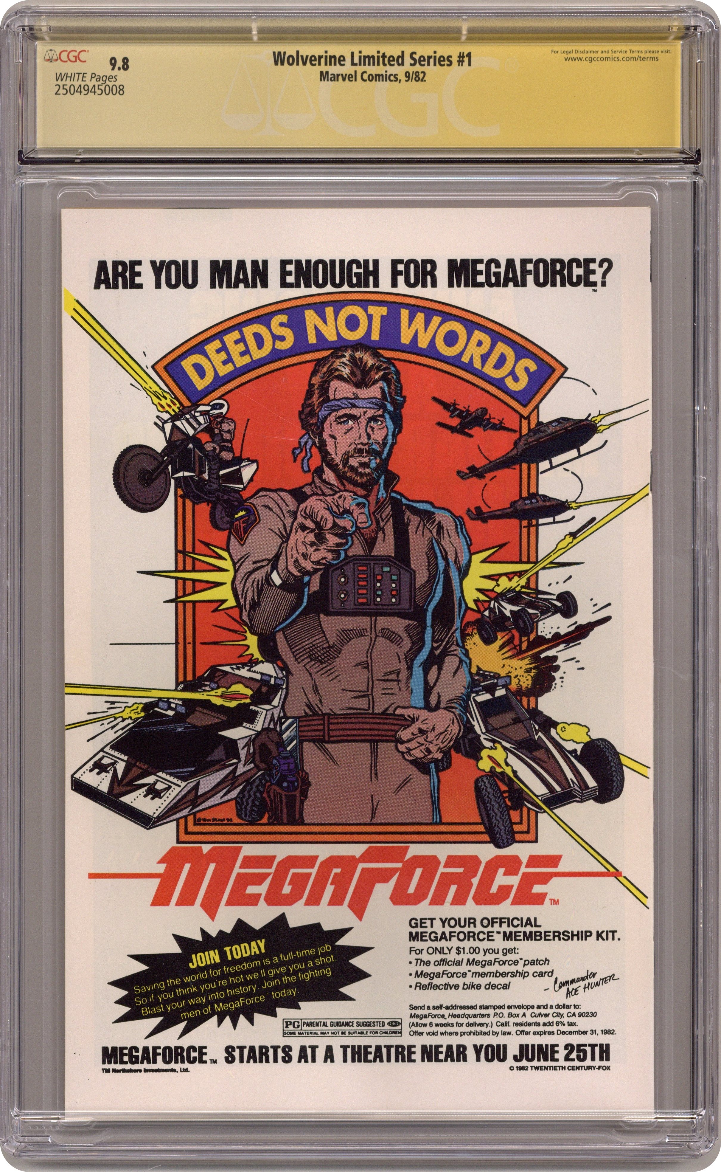 Direct Edition. 1 of 4 Featuring Wolverine in his first solo series fighting in Japan. "Wolverine." Script by Chris Claremont, pencils by Frank Miller, inks by Joe Rubinstein. Miller/Rubinstein cover. Back cover MegaForce ad with art by William Stout. Cover price $0.60. Grade: CGC 9.8 explanation of grade Condition: Used (collectible)