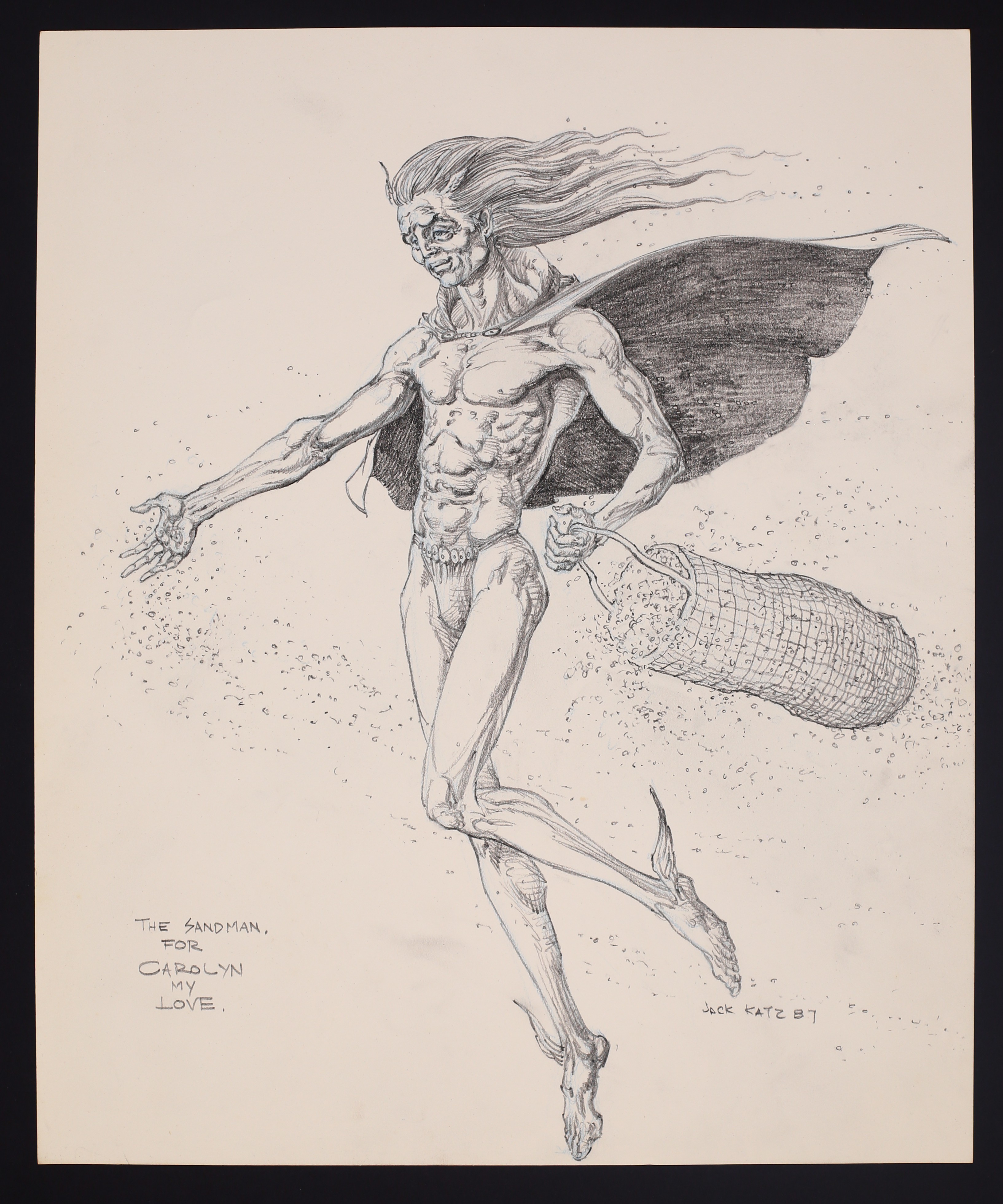 The Sandman Sketch by Jack Katz. Signed by the artist and personalized to Carolyn. Blue line and standard pencil on heavy stock sprayed with sealant. 14" x 17", B&W.