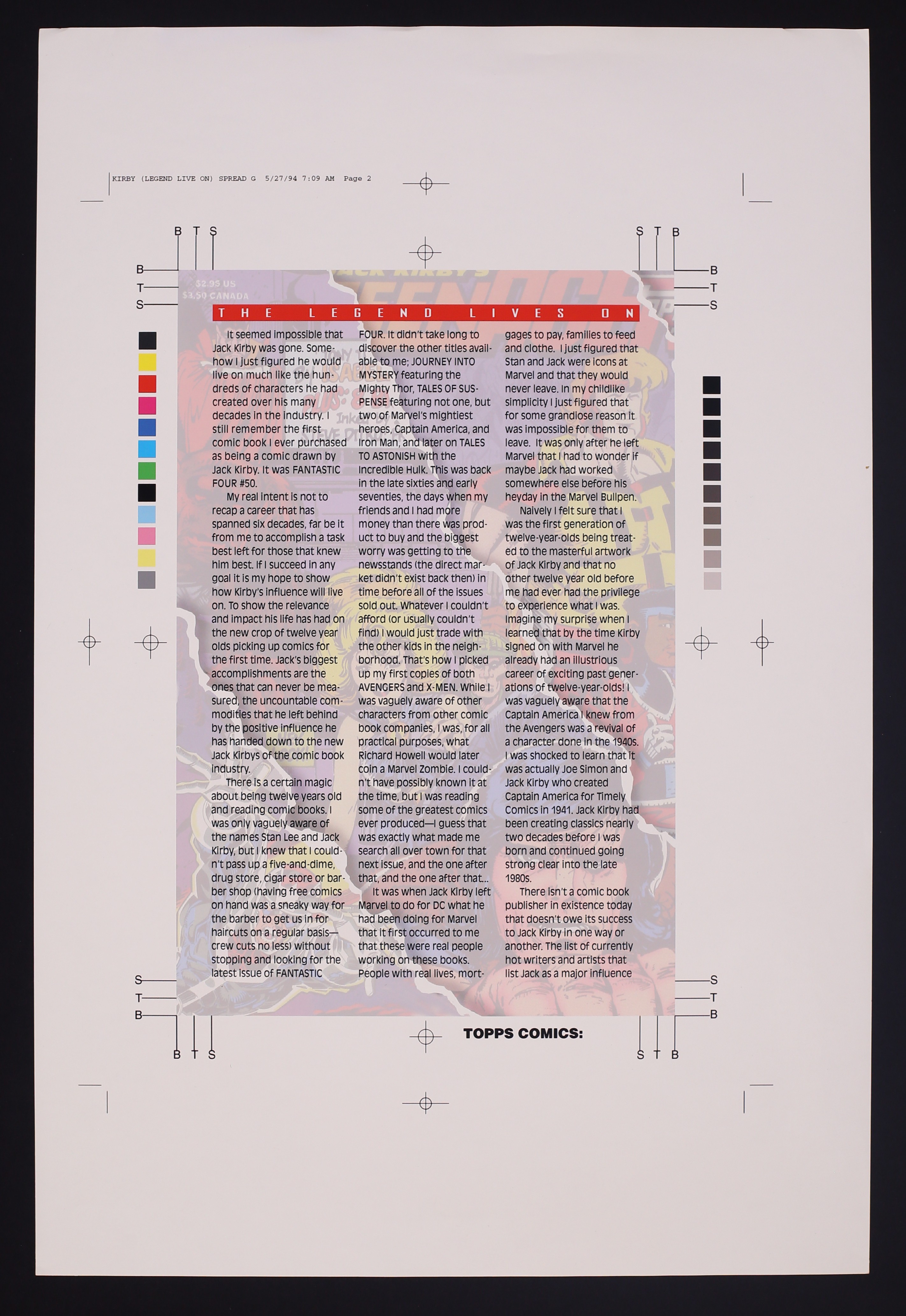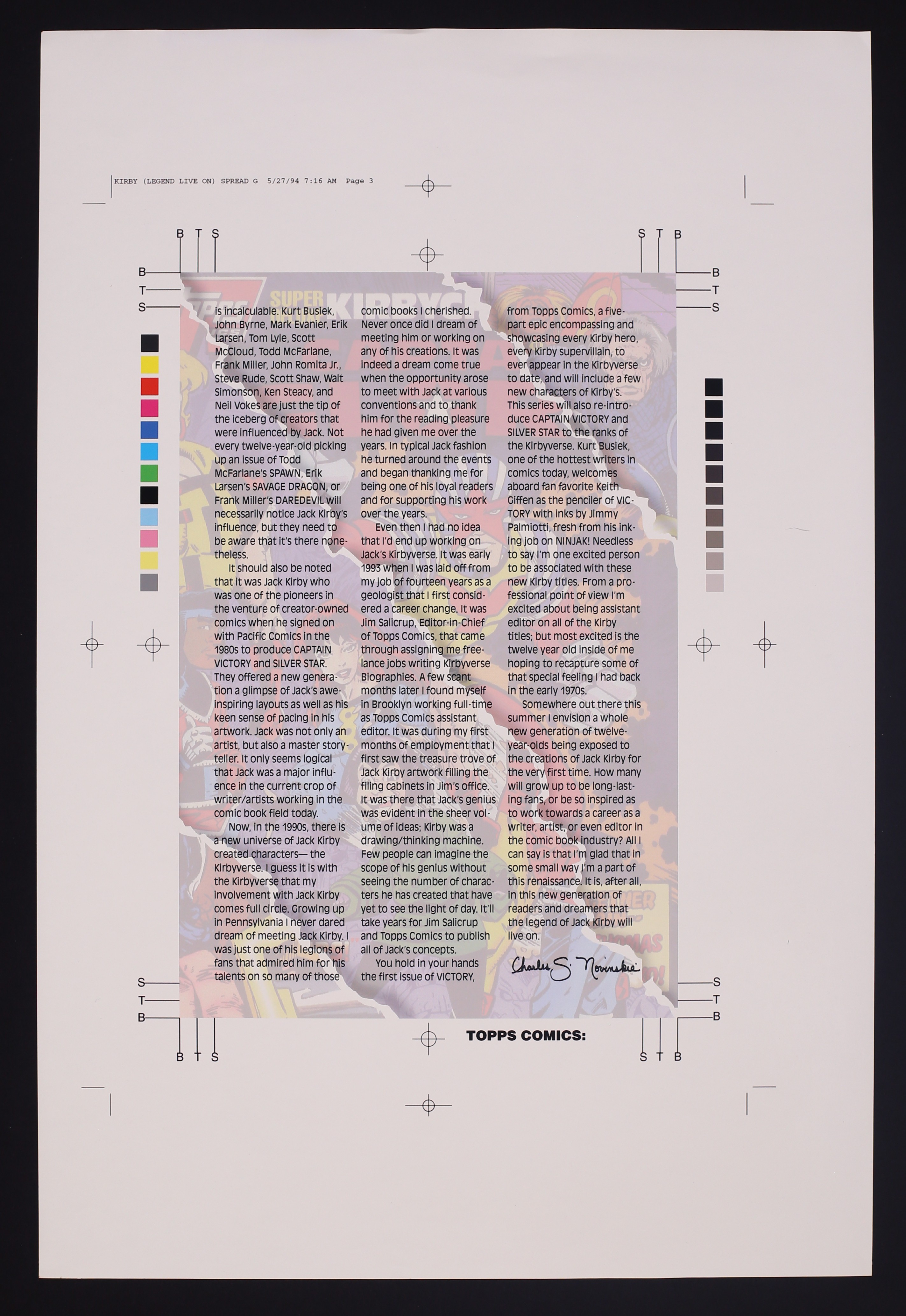 Production Proofs for Topps Comics Jack Kirby Tribute. Three 12" x 18" glossy pages, the first featuring art by Keith Giffen and the last two featuring the text of Charles Novinskie's tribute to Kirby.