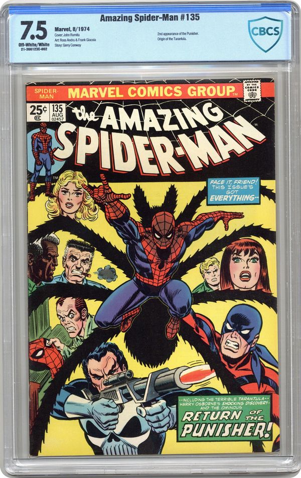 Ended Jul 16 2023 Winning Bid $162 Cover by John Romita Sr. Second full appearance of the Punisher in "Shoot-Out in Central Park," script by Gerry Conway, pencils by Ross Andru, inks by Frank Giacoia; Spider-Man finds himself in a shoot-out with Tarantula and Punisher after saving a cruise ship from hijacking; Peters friends grow suspicious about his double identity; Harry Osborn discovers Peters spider suit! Letter to the editor from Steve Saffel. The letters page also has Marvel Value Stamp series A # 4: Thing (of the Fantastic Four). Reprinted in Marvel Tales # 112 and 211. 36 pgs., full color. $0.25. Cover price $0.25. Grade: CBCS 7.5 explanation of grade Condition: Used (collectible)