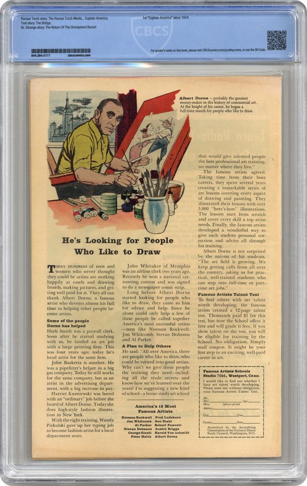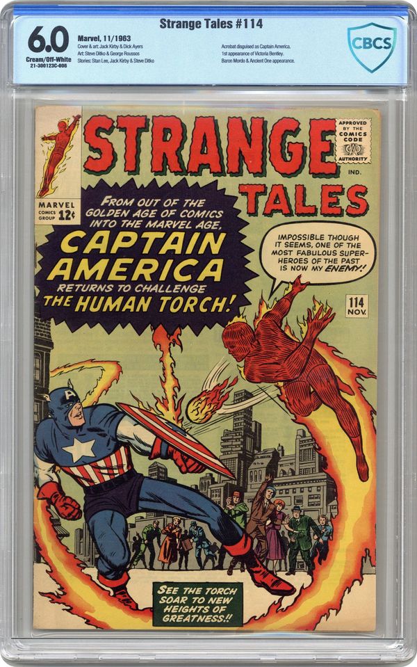 Cover pencils by Jack Kirby, inks by Dick Ayers. "The Human Torch Meets... Captain America", script by Stan Lee (co-plot, dialogue) and Jack Kirby (co-plot, uncredited), pencils by Jack Kirby, inks by Dick Ayers; The Human Torch is upstaged by the return of Captain America, but the Torch realizes that it is his old enemy the Acrobat in disguise and defeats him; This is the first appearance of Captain America since the Golden Age (though it's actually the Acrobat from issue 106 disguised as the hero). "The Bridge" text story. Third appearance of Dr. Strange in "The Return of the Omnipotent Baron Mordo!", script by Stan Lee and Steve Ditko (co-plot), pencils by Steve Ditko, inks by George Roussos; Strange is lured into a trap in England by Baron Mordo, but defeats him with the help of a woman with latent magical talents; First appearance of Victoria Bentley. 36 pgs., full color. Cover price $0.12. Grade: CBCS 6.0 explanation of grade Condition: Used (collectible)
