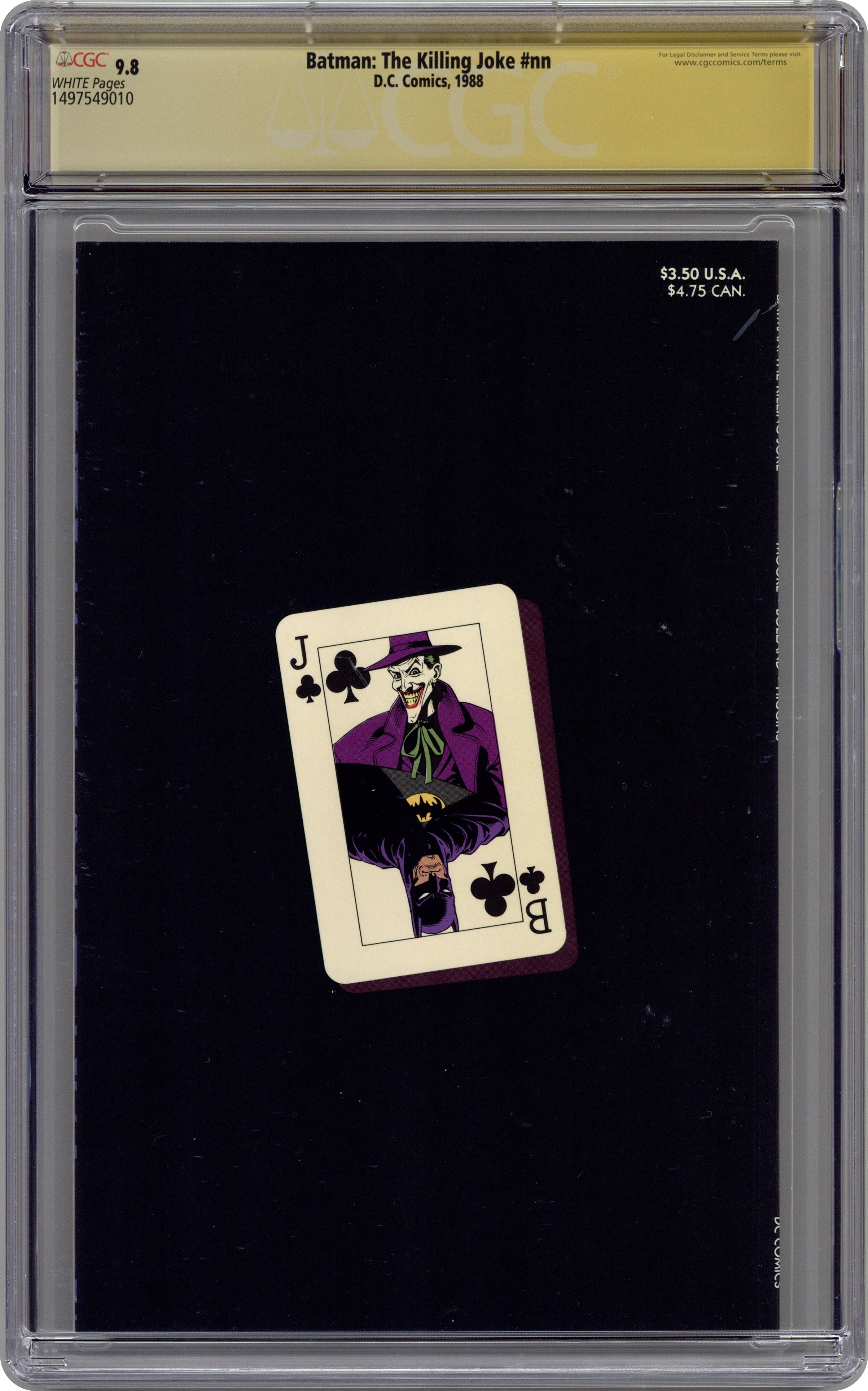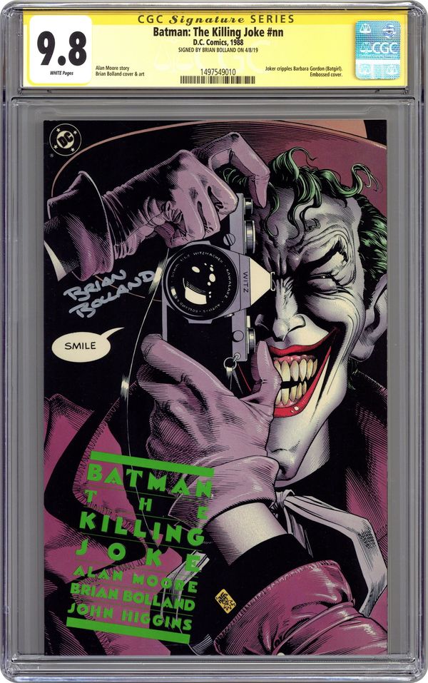 1st Printing. Batman matches wits with his arch nemesis The Joker in this critically acclaimed, prestige format one-shot. He also laughs at one of his jokes. The book is infamous for the scene in which The Joker shoots and cripples Barbara Gordon, effectively ending her crime fighting career as Batgirl. Written by Alan Moore, with art by Brian Bolland. 52 pages, full color. NOTE: 1st Printing, title is printed in lime green embossed ink. All others are later printings. Cover price $3.50. Grade: CGC 9.8 explanation of grade Condition: Used (collectible)