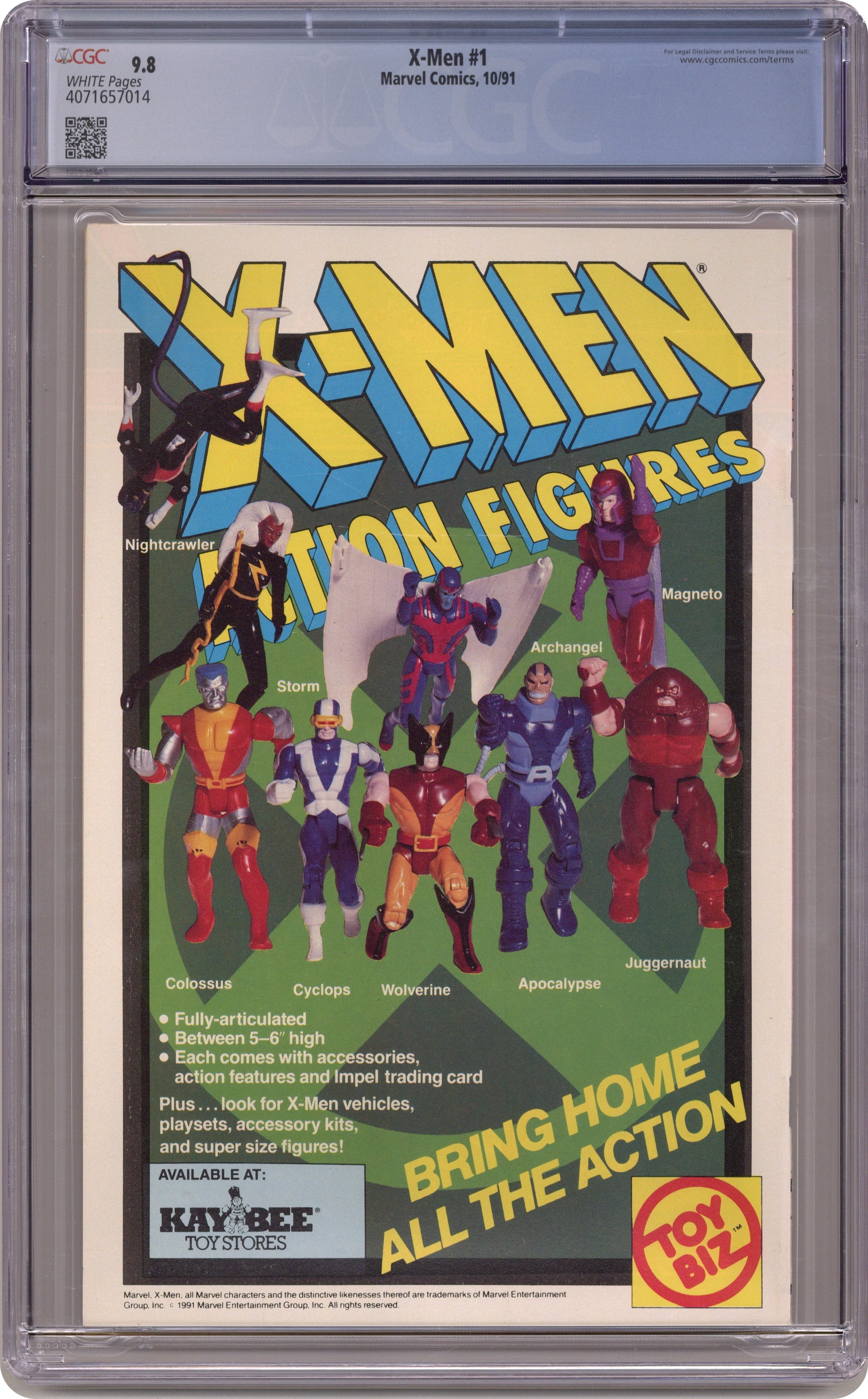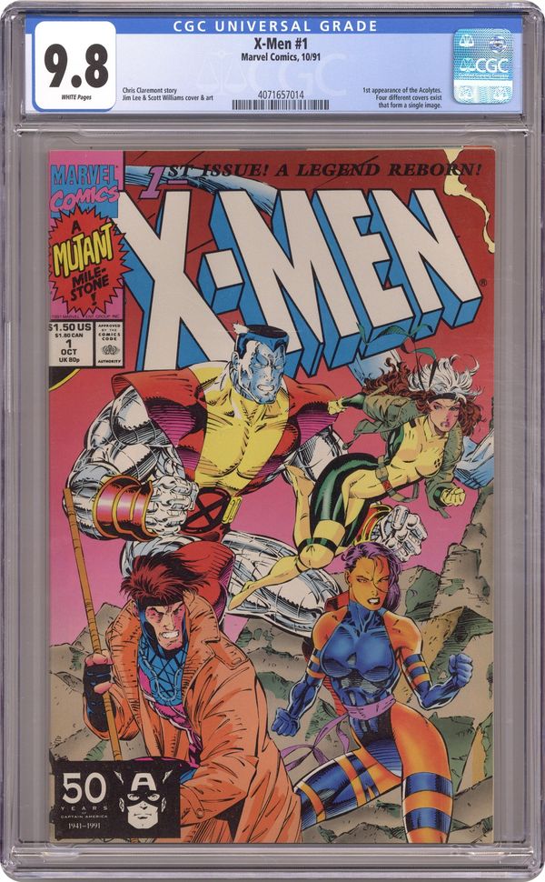 Direct Edition. Colossus/Gambit/Psylocke/Rogue cover. Cover pencils by Jim Lee (signed), inks by Scott Williams. Rubicon, script by Jim Lee (Co-Plot) and Chris Claremont, pencils by Jim Lee, inks by Scott Williams; Magneto forms the Acolytes and proclaims Asteroid M a haven for mutants everywhere; But the rest of the world doesn't see it that way; Nick Fury cameo. 2-page pin-up: gallery of X-Men villains. X-Men Sketchbook by Jim Lee. Cover price $1.50. NOTE: Cover B connects to covers 1A, 1C, and 1D to form a single giant image. Cover price $1.50. Grade: CGC 9.8 explanation of grade Condition: Used (collectible)