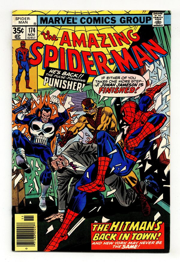 Ended Dec 8 2023 Winning Bid $15 "The Hitman's Back in Town!" Part 1 of 2. Guest-starring the Punisher. Script by Len Wein. Art by Ross Andru (breakdowns), Jim Mooney (finishes), and Tony DeZuniga (finishes). Cover by Ross Andru and Frank Giacoia. The Hitman is back! And he's got a brand new target: J. Jonah Jameson! But there's another gun-toting vigilante back in town too: the Punisher! And he's tracking the Hitman! Mix in the wondrous wall-crawler...and as shown on the dynamic cover, all concerned parties come together in JJJ's corner office! Pandemonium erupts when the bullets start flying! Stay down Jonah! Let Spidey and the Punisher take the hit (man)! Cameo appearances by Harry Osborn, Flash Thompson, Dr. Marla Madison, and Dr. Bart Hamilton. First 35ยข issue. (Notes: The Hitman previously appeared in Spectacular Spider-Man 5. This story was reprinted in Marvel Tales 216.) 36 pages Cover price $0.35. Grade: FN 6.0 explanation of grade Condition: Used (collectible)