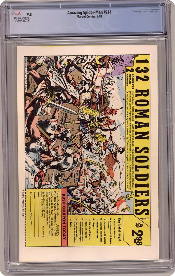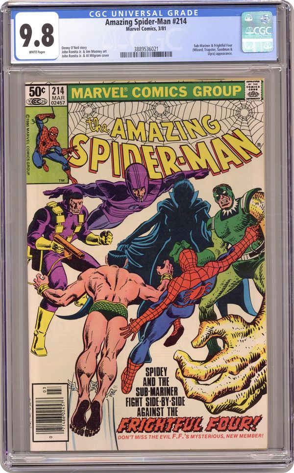 Direct Edition. "Then Shall We Both Be Betrayed!" Part 2 of 3. Guest-starring the Sub-Mariner. Script by Denny O'Neil. Art by John Romita Jr. (breakdowns) and Jim Mooney (finishes). Cover by John Romita Jr. and Al Milgrom. After torching Peter Parker's Chelsea apartment, the Wizard and Llyra go back to Ryker's Island and free the Sandman and the Trapster! And just like that the Frightful Four is together again! Meanwhile in midtown, a tired web-slinger (and his fellow tenants) check into a nice hotel following their narrow escape from their burning building last issue. But out of the blue the Sub-Mariner smashes into one of the adjoining rooms and threatens Peter's attractive neighbor! Aunt May's nephew is furious! Are Spider-Man and the Avenging Son going to throw down again? Why yes they are! And the winner gets...the Frightful Four! (Notes: Llyra previously appeared in Sub-Mariner (1st series) 50. This issue includes a bizarre full-page parody of the cover to the classic Uncanny X-Men 142 (by Jim Salicrup and Terry Austin). The Sentinel on the cover says: "Hi kids! We're back again! And we've killed all the X-Men! Really! 'Cept Kitty, and she's real small." It's believed that Amazing Spider-Man 214 was the only issue that featured this special advertisement.) 36 pages. Cover price $0.50. Grade: CGC 9.8 explanation of grade Condition: Used (collectible)