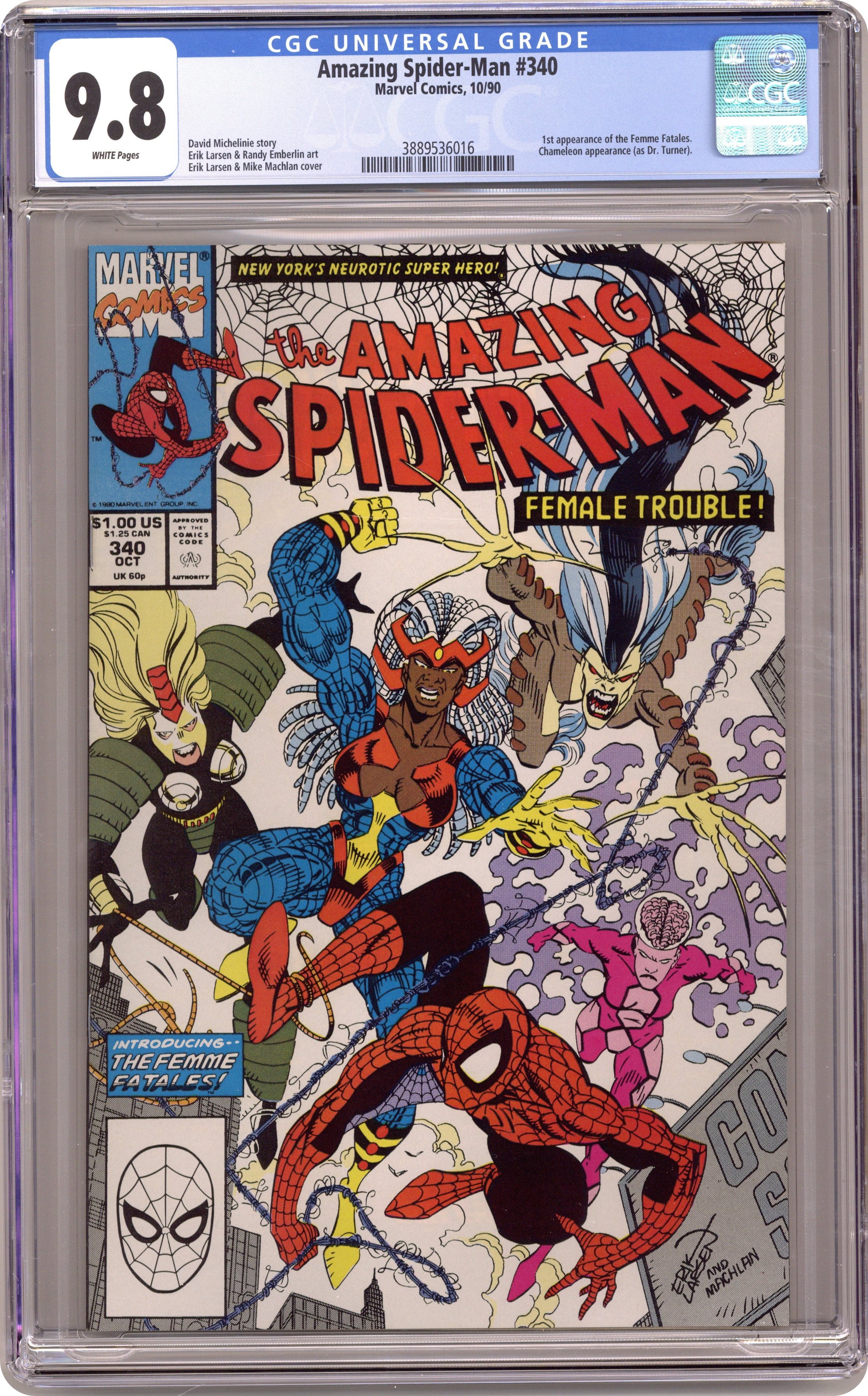 "The Hero Subtracter" Script by David Michelinie. Pencils by Erik Larsen. Inks by Mike Machlan, Randy Emberlin, and friends. Cover by Erik Larsen and Mike Machlan. Due to concerns about his dear aunt's health, Peter debates whether or not it's time to give up being Spider-Man. And fortuitously he bumps into a doctor on the street that might be able to take away his powers! But has Spidey checked the references on this mysterious Doctor Turner? That might be a good idea first! In the meantime though, the wondrous wall-crawler has a rendezvous with the Femme Fatales at Kennedy Airport! And these ladies play rough! First appearances of Knockout and Mindblast. Cameo appearances by Aunt May, Mary Jane Watson, J. Jonah Jameson, and the Chameleon. (Note: Bloodlust and Whiplash previously appeared in Marvel Comics Presents 49 & 50.) 32 pages. $1.00 cover price. Cover price $1.00. Grade: CGC 9.8 explanation of grade Condition: Used (collectible)