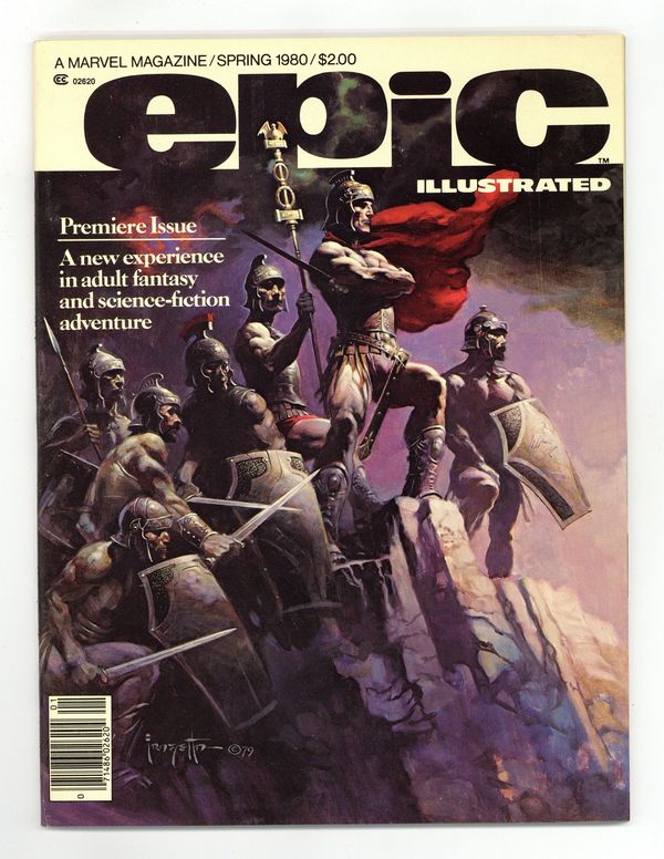 Ended Jul 3 2023 Winning Bid $36 Cover by Frank Frazetta. Written by Stan Lee, Wendy Pini, Leopoldo Duranona, Bob Larkin, Jim Starlin, Ray Rue, John Poscik, Mirko Ilic, Ernie Colon, Arthur Suydam, George Bush and Carl Potts. Art by John Buscema, Rudy Nebres, Wendy Pini, Leopoldo Duranona, Bob Larkin, Jim Starlin, Ray Rue, Thomas Blackshear, Mirko Ilic, Ernie Colon, Arthur Suydam, George Bush and Carl Potts. Epic Illustrated was touted as a new experience in adult fantasy and science fiction adventure. Published by Marvel Comics, this magazine was aimed at a more mature audience. In this issue: A philosophical tale about God with Galactus, the Devourer of Worlds, and his herald the Silver Surfer in "The Answer" by Stan Lee, John Buscema and Rudy Nebres (with colors by Rick Veitch). Plus: Selah defies her father, Olbar, to be with Malak in the ElfQuest story "Homespun" by Wendy Pini; "Aware" by Leopoldo Duranona; "For the Next 60 Seconds" by Bob Larkin; "Aknaton (Metamorphosis Odyssey Chapter I)" by Jim Starlin; "Lullabye of Bedlam" by Ray Rue; "Elfspire" (preview excerpt of an illustrated text story) by John Poscik and Thomas Blackshear; 1-pagers by Mirko Ilic - "History of Human Absurdity Part 1," "The Victor" and "Shakti"; "Convert" by Ernie Colon; "Heads" by Arthur Suydam; "Za! (Metamorphosis Odyssey Chapter II)" by Starlin; "Juliet (Metamorphosis Odyssey Chapter III)" by Starlin; "Detour" (text story with one illustration) by George Bush; and "Topaz" by Carl Potts. Plus: Feedback comments on Epic Illustrated from Neal Adams, Ray Bradbury, George Pal, Joseph Stefano and Ian Summers. Magazine, 96 pages, PC/PB&W. Cover price $2.00. Grade: FN 6.0 explanation of grade Condition: Used (collectible)