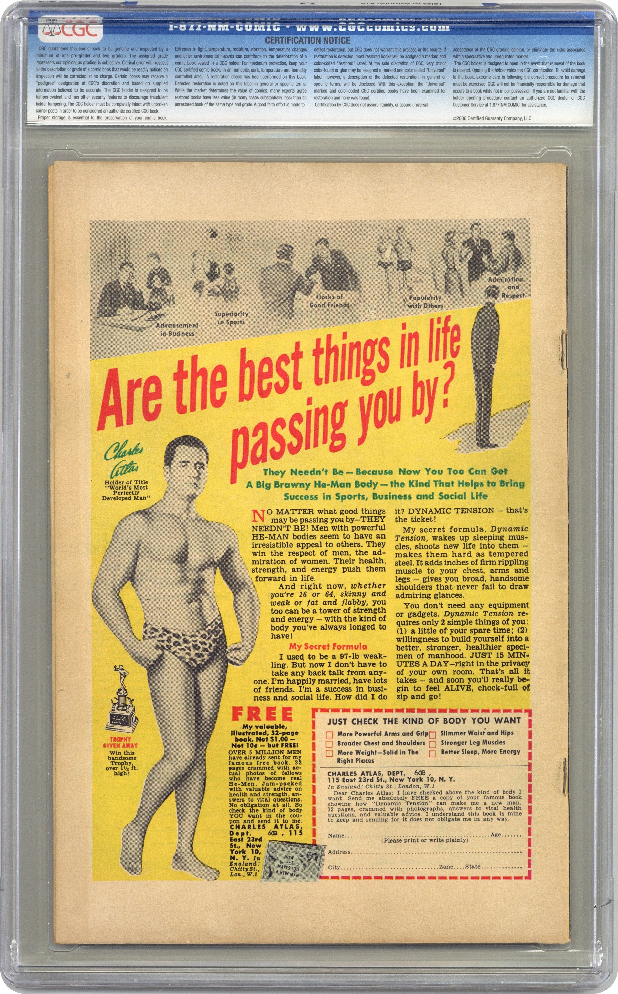 Ended Apr 22 2024 Winning Bid $257 Cover by Jack Kirby and Dick Ayers. Gorgilla Strikes Again! Part 1, art by Jack Kirby and Dick Ayers; Gorgilla stows away on a ship to America to contact the human race, but is met with fear and violence in New York. Gorgilla Strikes Again! Part 2, art by Jack Kirby and Dick Ayers. The Stranger, art by Joe Maneely. Monsteroso, art by Steve Ditko; A creature hatches from an egg and imagines itself lord of all it surveys, but it is suddenly drowned, as it is only a microbe in a scientist's culture. Robot on the Rampage!, art by Steve Ditko; A robot stationed at a lighthouse rebels against his human master and the man manages to lock the robot outside where the food supply is stashed, but thanks to the salty sea air, it rusts completely within a mere matter of hours rendering it harmless to carry out its threats. 36 pgs., full color. $0.10. Cover price $0.10. Grade: CGC 7.5 explanation of grade Condition: Used (collectible)