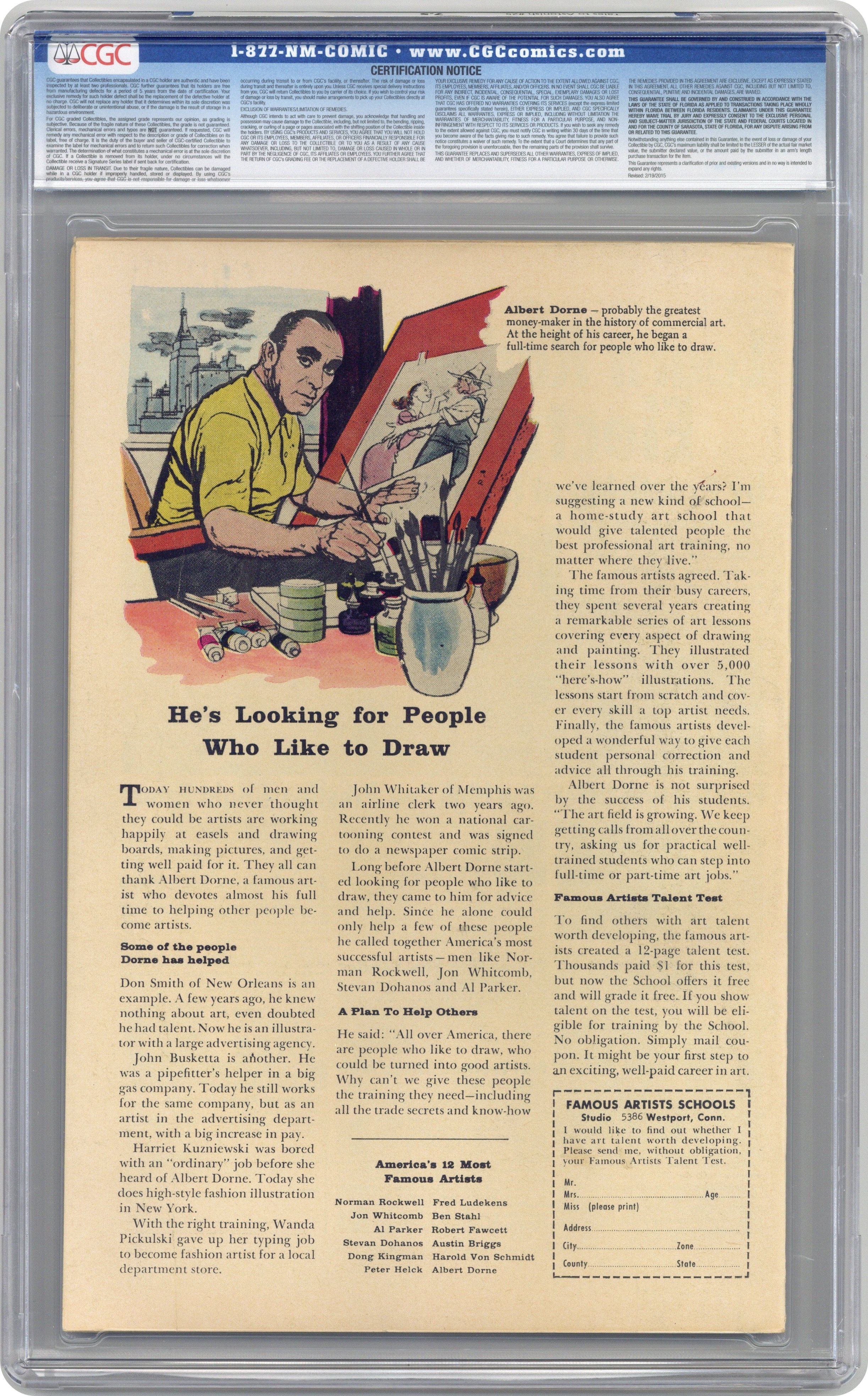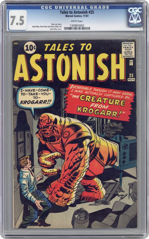 Ended Jan 25 2024 Winning Bid $320 Cover by Jack Kirby and Dick Ayers. I Was Captured by the Creature from Krogarr!, art by Jack Kirby and Dick Ayers; A dissolute human is targeted by an alien that can transport items through television sets, but he is saved by his failure to pay the electric bill. The Party text story. Behold Him! He Is the Martian!, art by Jack Kirby and Dick Ayers; A spy from Jupiter disguised as a human stows away on the first rocket from Earth to Mars. The Gypsy's Revenge!, art by Don Heck; An American criminal robs an old gypsy man, ignoring his pleas and curses. Where Lurks the Ghost!, script by Stan Lee, art by Steve Ditko; A man spends the night in a haunted house with the houses caretaker. 36 pgs., full color. $0.10. Cover price $0.10. Grade: CGC 7.5 explanation of grade Condition: Used (collectible)