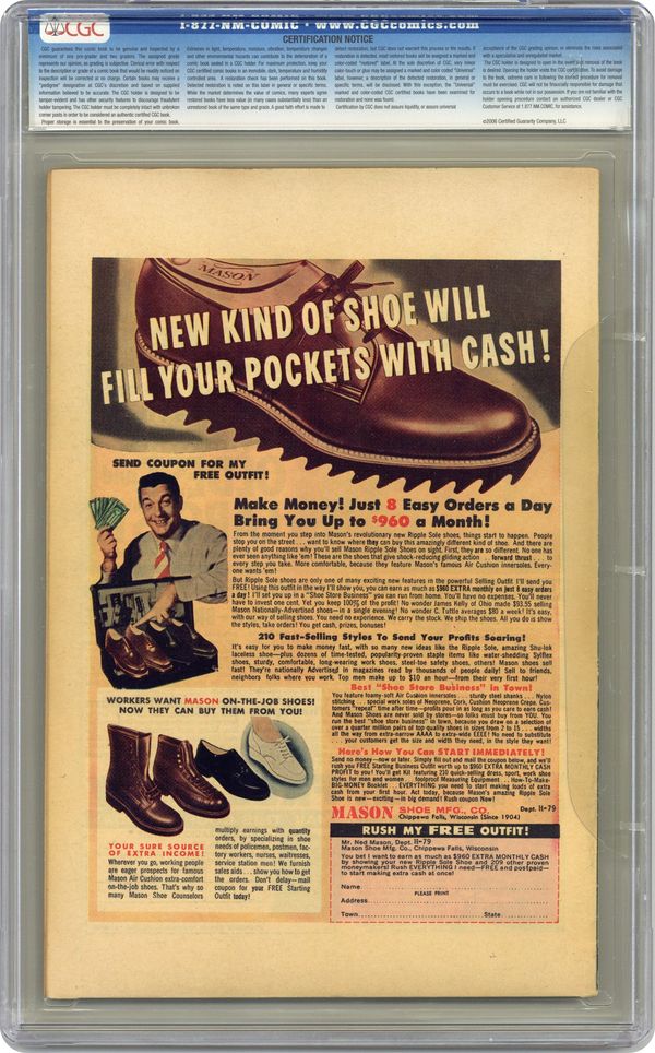Ended Oct 13 2023 Winning Bid $234 Cover by Jack Kirby and Sol Brodsky. The Return of the Gorilla-Man, art by Jack Kirby and Dick Ayers; The Gorilla-Man escapes and tries to get himself transformed back into a human, but instead he is blasted into space in an experimental space capsule. The Remedy Oil text story, art by Marie Severin. The Thing from the Hidden Swamp, art by Jack Kirby and Dick Ayers; A plain girl helps a stranded alien, and is made beautiful as a reward. What Was the Staggering Secret of the 13th Floor, art by Don Heck; An oddly cheerful elevator operator is held at gunpoint with a passer-by by a spy planning to blow up the hotel. Quogg!, script by Stan Lee, art by Steve Ditko; A fugitive hides in an enclosure said to contain a horrible monster, and realizes too late that the monster appeared to be an ordinary hut. 36 pgs., full color. $0.12. Cover price $0.12. Grade: CGC 7.5 explanation of grade Condition: Used (collectible)