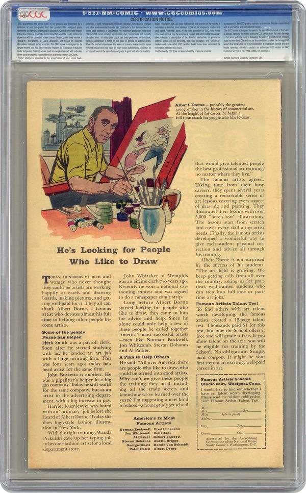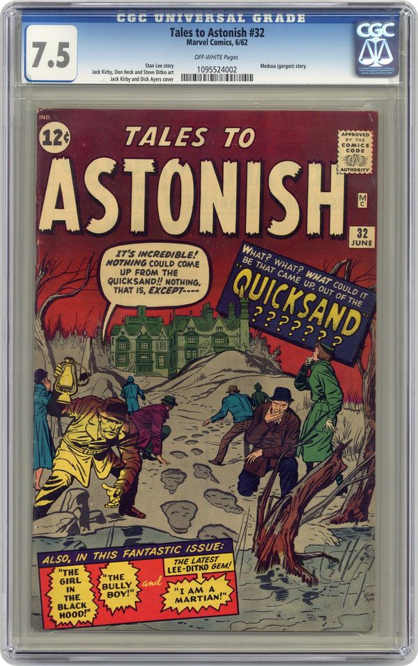 Ended Jul 13 2023 Winning Bid $488 Cover by Jack Kirby and Dick Ayers. Quicksand!, art by Jack Kirby and Dick Ayers; A greedy man tries to kill his brother to gain his half of the estate by tricking him into quicksand. Venus! text story. The Bully Boy!, art by Jack Kirby and Paul Reinman; An electronic teacher observes a weak student being bullied and offers to train him in body building and fighting styles. The Girl in the Black Hood!, art by and Don Heck; A famous photographer never allows anyone to see her face. I Am a Martian!, script by Stan Lee, art by Steve Ditko; A man cant get anyone to believe that he is a Martian, but when he is allowed to modify a fire truck ladder he uses it to get home. 36 pgs., full color. $0.12. Cover price $0.12. Grade: CGC 7.5 explanation of grade Condition: Used (collectible)