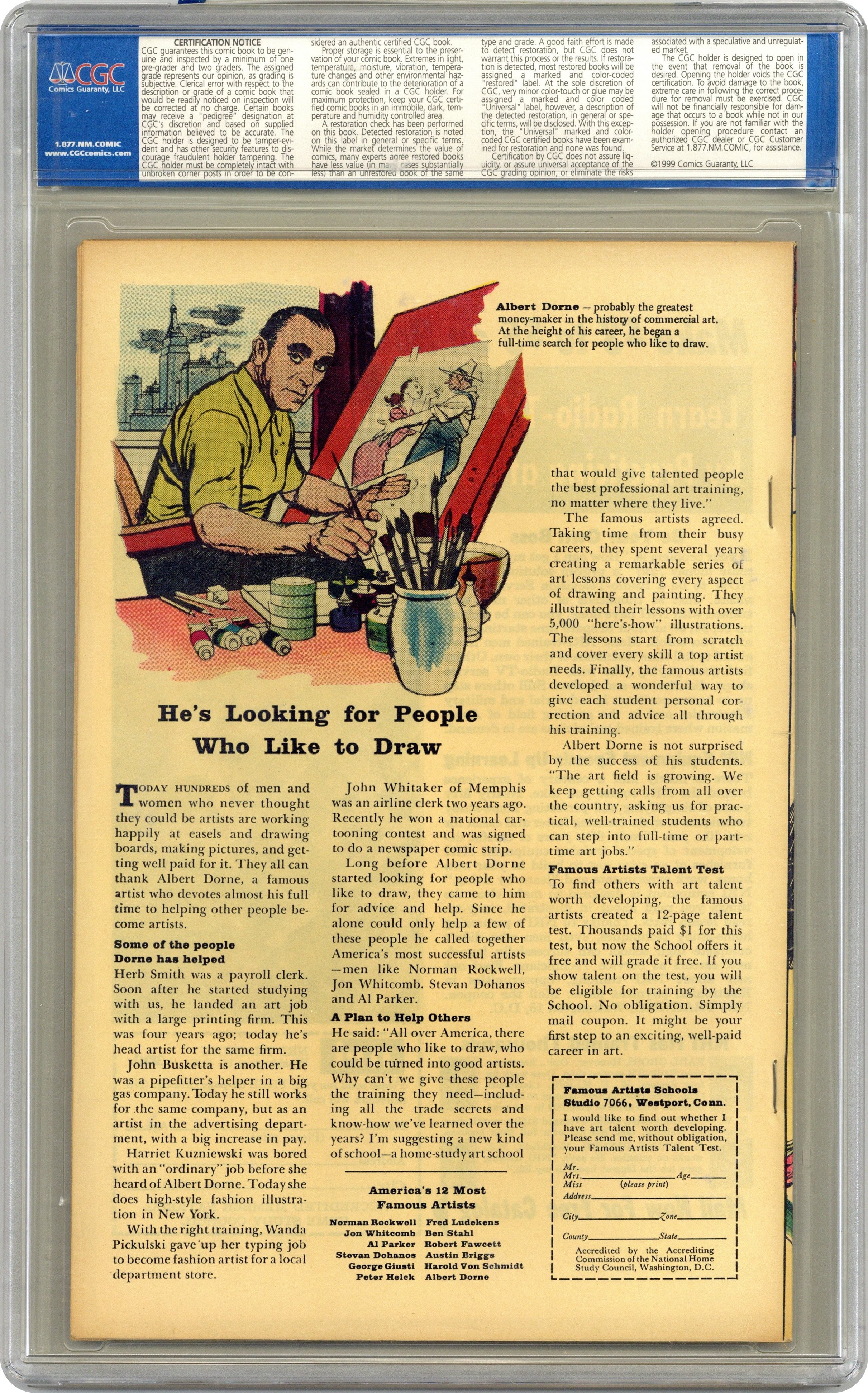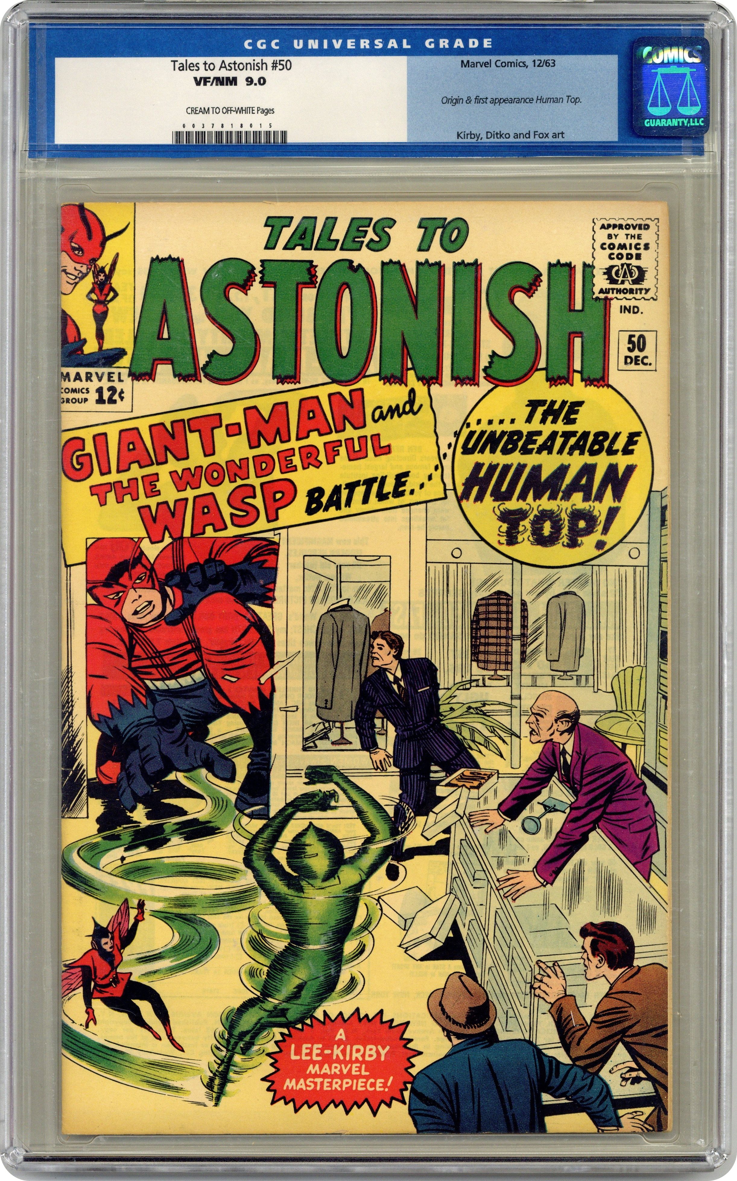 Ended Apr 25 2024 Winning Bid $160 Cover by Jack Kirby and Sol Brodsky. The Human Top!, script by Stan Lee, art by Jack Kirbym, Steve Ditko, and Don Heck; Henry Pym follows the crime spree of the Human Top in the newspapers but the Wasp convinces Henry to go after him as Giant-Man. Mystery Trip text story, art by Joe Maneely; Tommy's uncle returns from a space journey needing to re-learn how to walk on earth instead of floating. The Secret of Sagattus!, script by Stan Lee and Larry Lieber, art by Larry Lieber and Matt Fox; A wise king listens only to the advice of a hunchback, causing the jealous nobles to murder the hunchback. No Ending!, script by Stan Lee and Larry Lieber, art by Larry Lieber; A dictator is tormented by dreams of running on a treadmill suspended high in the sky. 36 pgs., full color. $0.12. Cover price $0.12. Grade: CGC 9.0 explanation of grade Condition: Used (collectible)